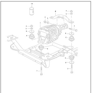 My last posts showed how the transmission flange is pointing down at a steeper angle than the front diff flange. I could not see a way of easily changing the transmission angle so I decided to shift the front diff. I supported the diff with a bottle jack and took off the front carrier and the rubber mount. You can see where the mounts go in the diagram, (No. 6). Looking at the mounts, I could see the lower mount was squished a bit.