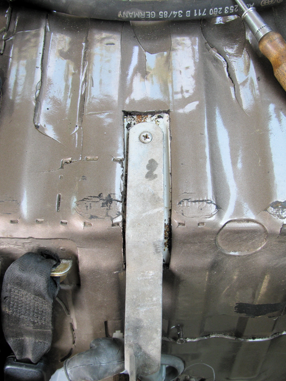 I mentioned before that just drilling a hole through the sheet metal of the rear deck to attach the rear seat/bed brackets is not good enough to get a firm connection. The screws used are self tapping screws which sort of implies, I think, that the factory did not weld on nuts on the underside of the sheet metal. Looking closely into the holes in my ’82 Westy the metal appears thicker than in the same place on my ’86 syncro. Here is view from inside of van of one of the brackets in place (in place but askew).