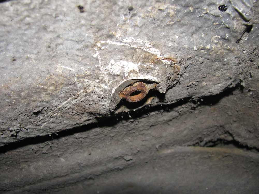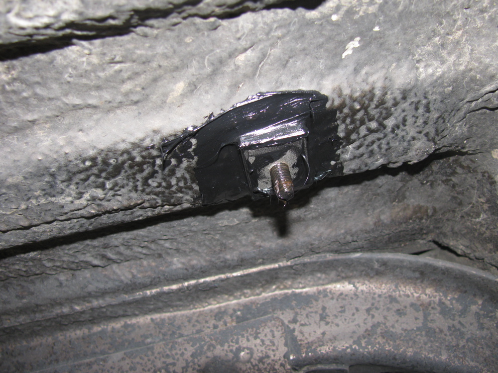 And here is one of the little chaps stuck up in the passenger side rear wheel well where the right hand bracket screw comes through – boy am I slow, it just occurred to me now to check the same place in the Westy to see if there is any similar thing going on. Edit: I just looked at the passenger side rear wheel well on my ’82 Westy where the bracket screw comes through, and lo and behold, looks like a nut is there, surrounded by goop. I assume same thing done for other bracket. So I am not completely mad thinking my little plates will work.