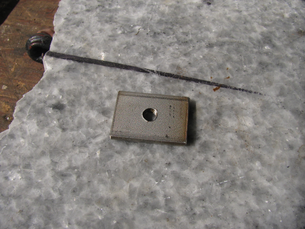 So I set about making some little backing plates to give the screws more thread to love. I used 3/16″ thick stainless bar to make to little plates, 3/4″ wide, 1″ long and a hole in each tapped for 6 X 1.00 mm thread. My plan was to use some Sikaflex to glue the plates to the underside of the deck so that the would stay in place when I screwed the the brackets down. Here is exciting picture of one of the “plates”.