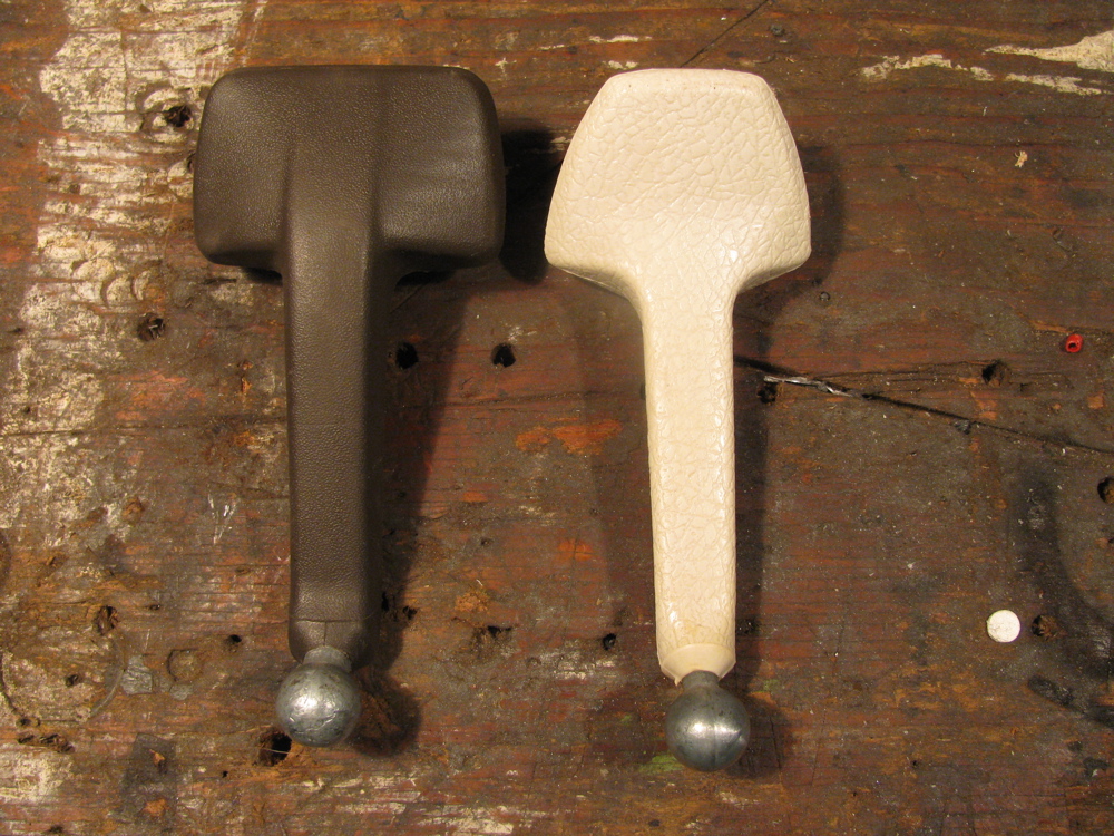 The baywindow stalk is perhaps a tad longer than the vanagon’s, but the attachment angle is different. The upshot is it may provide a bit better rear view. Pictures to prove this assertion to come, but for now some pics of the stalks. The baywindow stalk in off white, the Vanagon in brown.