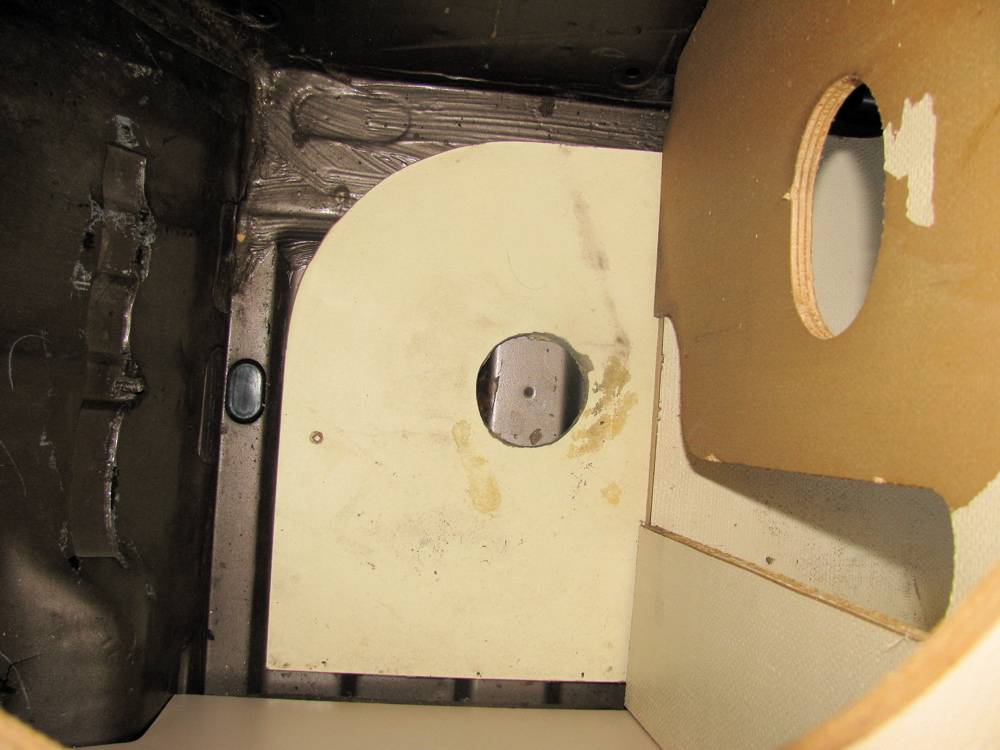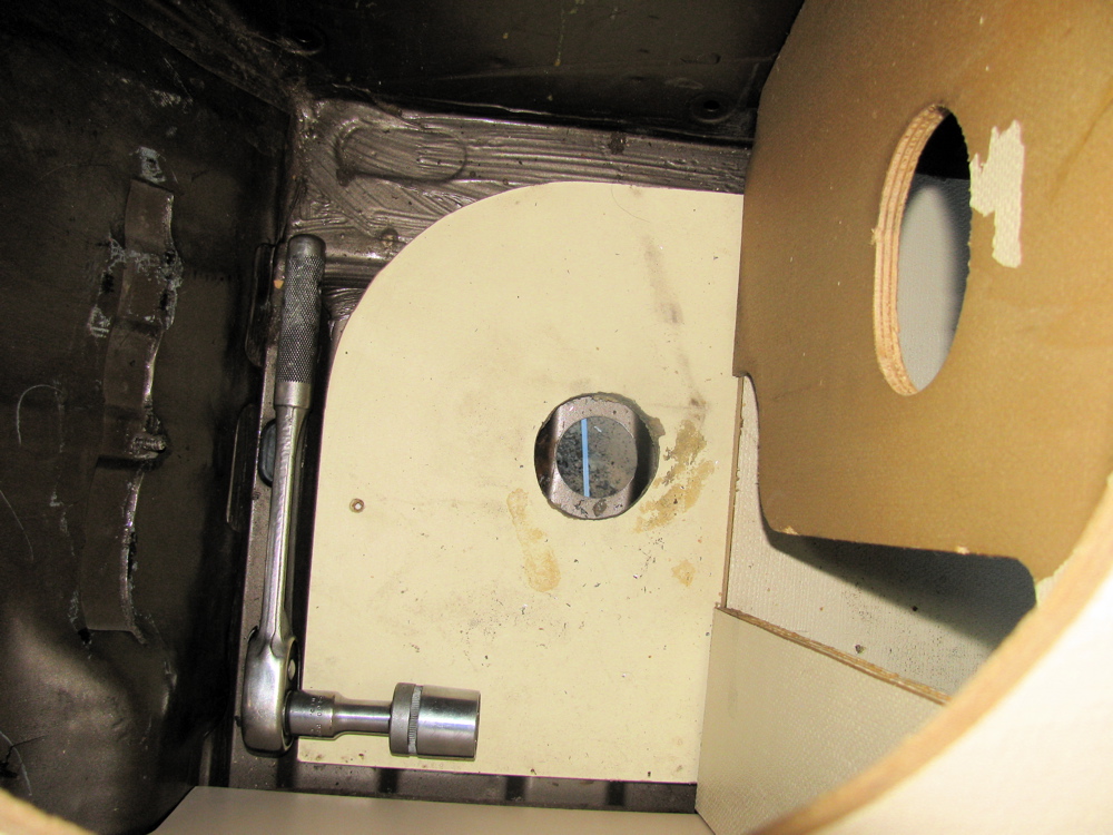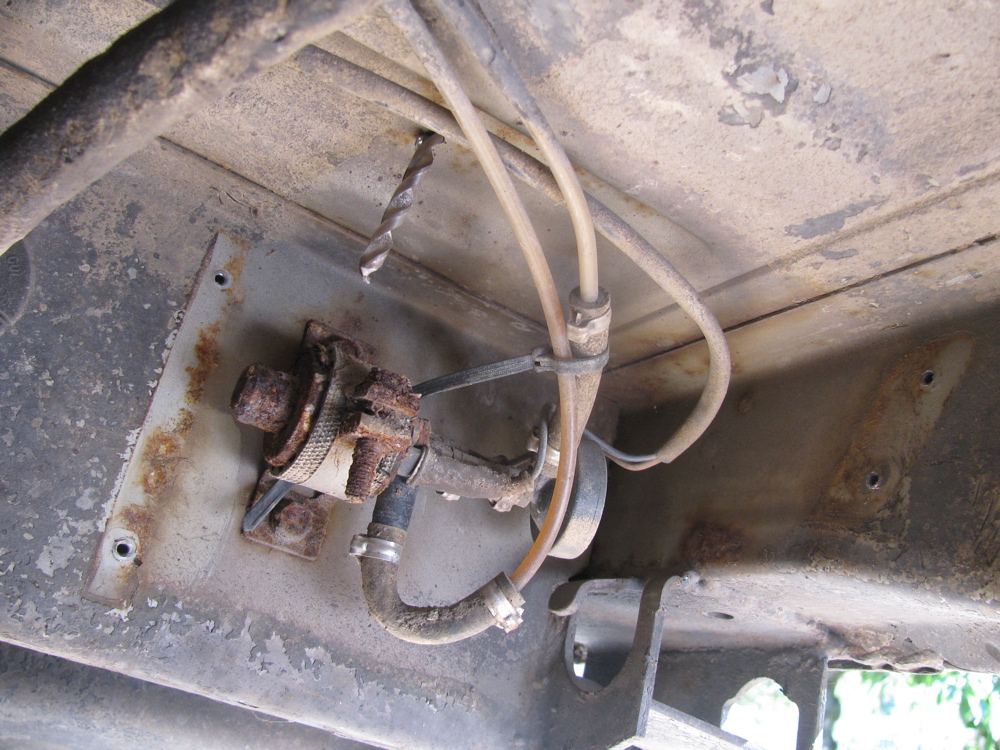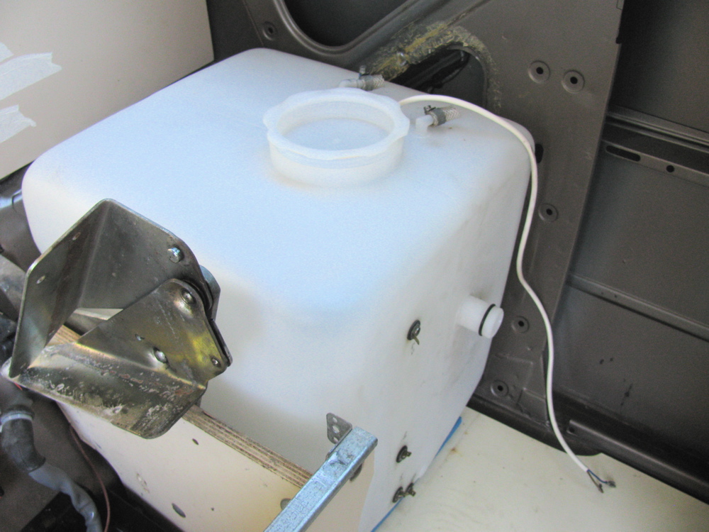 Hot day today, for Lower Vancouver Island, in the low 30’s. All I felt like doing after the overhead cabinet install was installing the fresh water tank. It sits against the angled back wall on the drivers side, and the drain pokes through hole in the floor. I measured where that hole is in my ’82 Westy , but crikey, there was a dimple on the Syncro’s floor right where the hole is supposed to be. And same thing further forward for the sink drain hole.