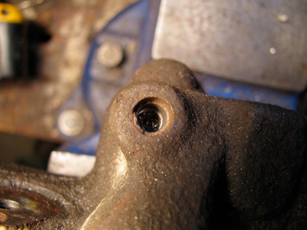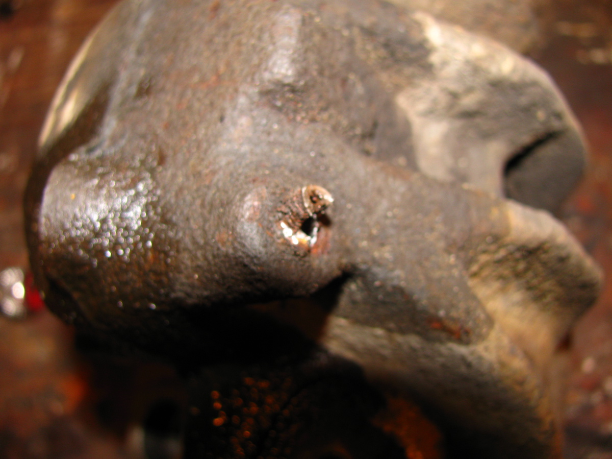 I tried spiral type bolt extractor but no luck. I then started to drill, carefully, not full diameter which is 7 mm, and not full depth. I was worried about damaging threads and also the conical base of the hole that forms the seal with the conical point of the bleeder. I then hit it with lots of heat, hoping the shell of the bleeder would separate from the body. No such luck and I got more frustrated and drilled wider and deeper.