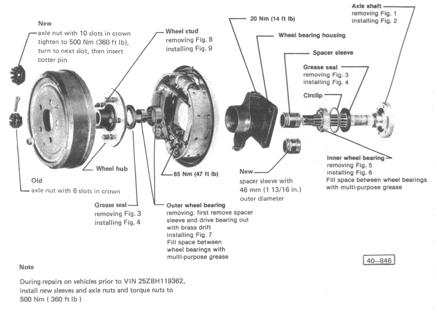 I noticed some play in right rear wheel (jacking up van and trying to move wheel, 12 and 6 o’clock positions) and a whiny noise when driving which changed in loudness on turns. I figured it was time to replace the bearings. These bearings seem to last a long time but there is a limit I guess. For another good description of this procedure have a look at the English translation of the German IG16 wiki entry. To start here are a couple of exploded diagrams showing all the parts.