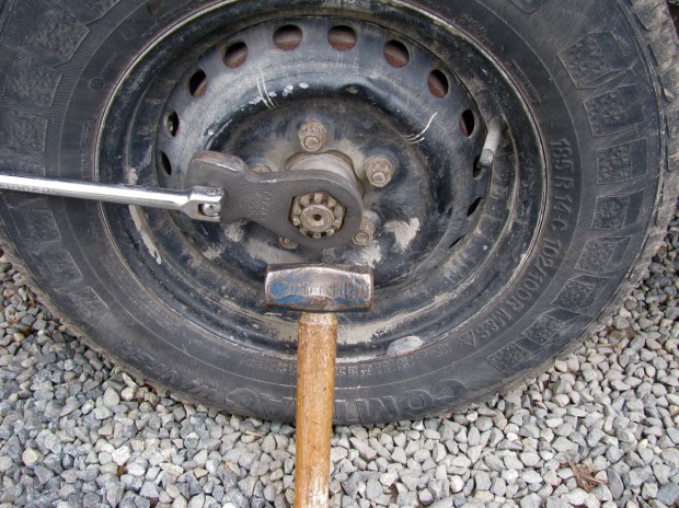 It makes a lot of sense to take out the axle at same time so that you can re-lube the CV joints and also press the stub axle into the bearing housing on the bench. But I didn’t do that as I was short on time. If you do want to take out the axle, undo the transmission side CV joint when you still have the wheel on the van, unless you are using air tools, so that you can brace the wheel when undoing the CV bolts. First thing is to undo the 46 mm castle nut on the wheel. It’s on there tight (275 – 350 ft/lbs) so you need to do it with the van on the ground and the wheels chocked. Normally I use a 3/4″ drive socket and a long armed drive with some steel pipe as an extension. But this time I tried out one of those “slug wrenches”, I was given one a few months ago. The idea is that (after removing split pin on nut) you attach slug wrench to nut, use a 1/2″ socket wrench drive to apply some force, and at same time whack the slug wrench with a short sledge hammer. Its a bit awkward, the wrench lies close to the wheel so ou have to aim carefully so as to not hit the rim. But it worked, the nut came loose.