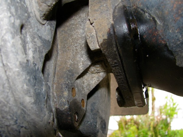 See the dowel pin below the bolt holes in above pic? Wet area on trailing arm is due to some rust busting liquid I squirted on exposed threads on the 4 bolts holding the bearing housing on to the trailing arm. With the parking brake line detached from trailing arm it is possible to to pull off brake assembly from stub axle and lay to the side on the ground.