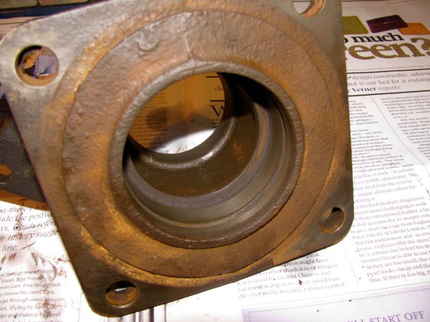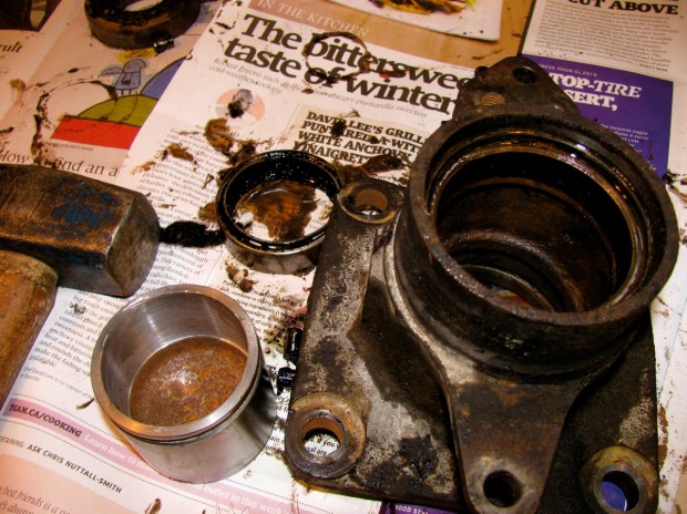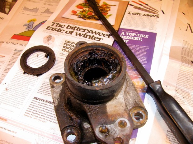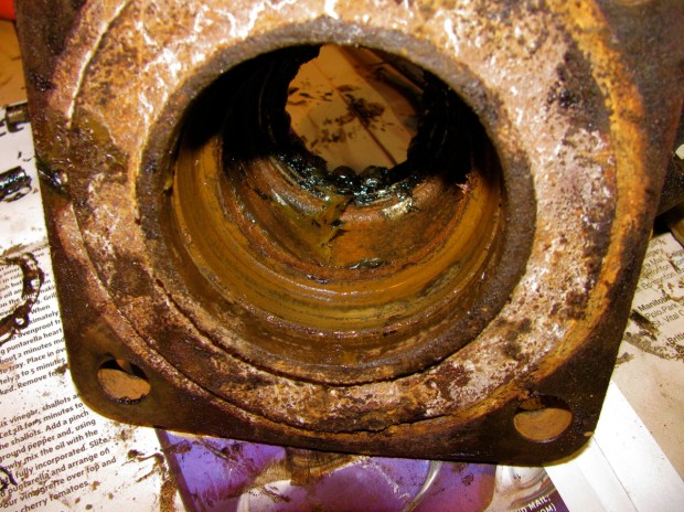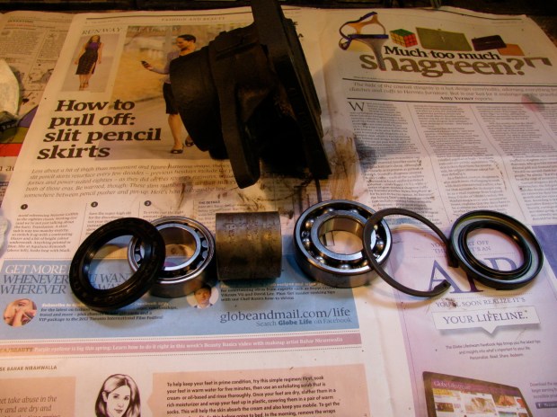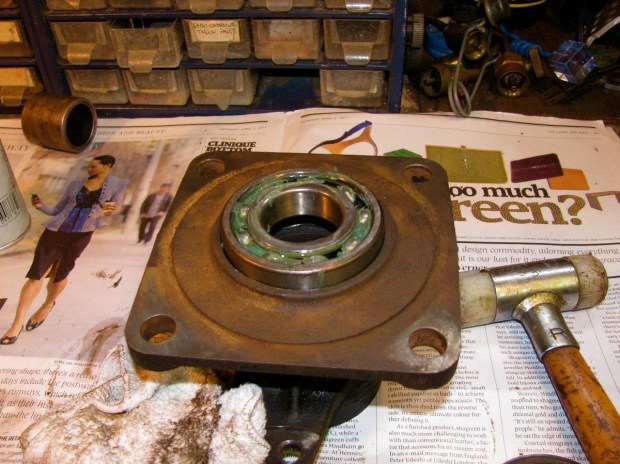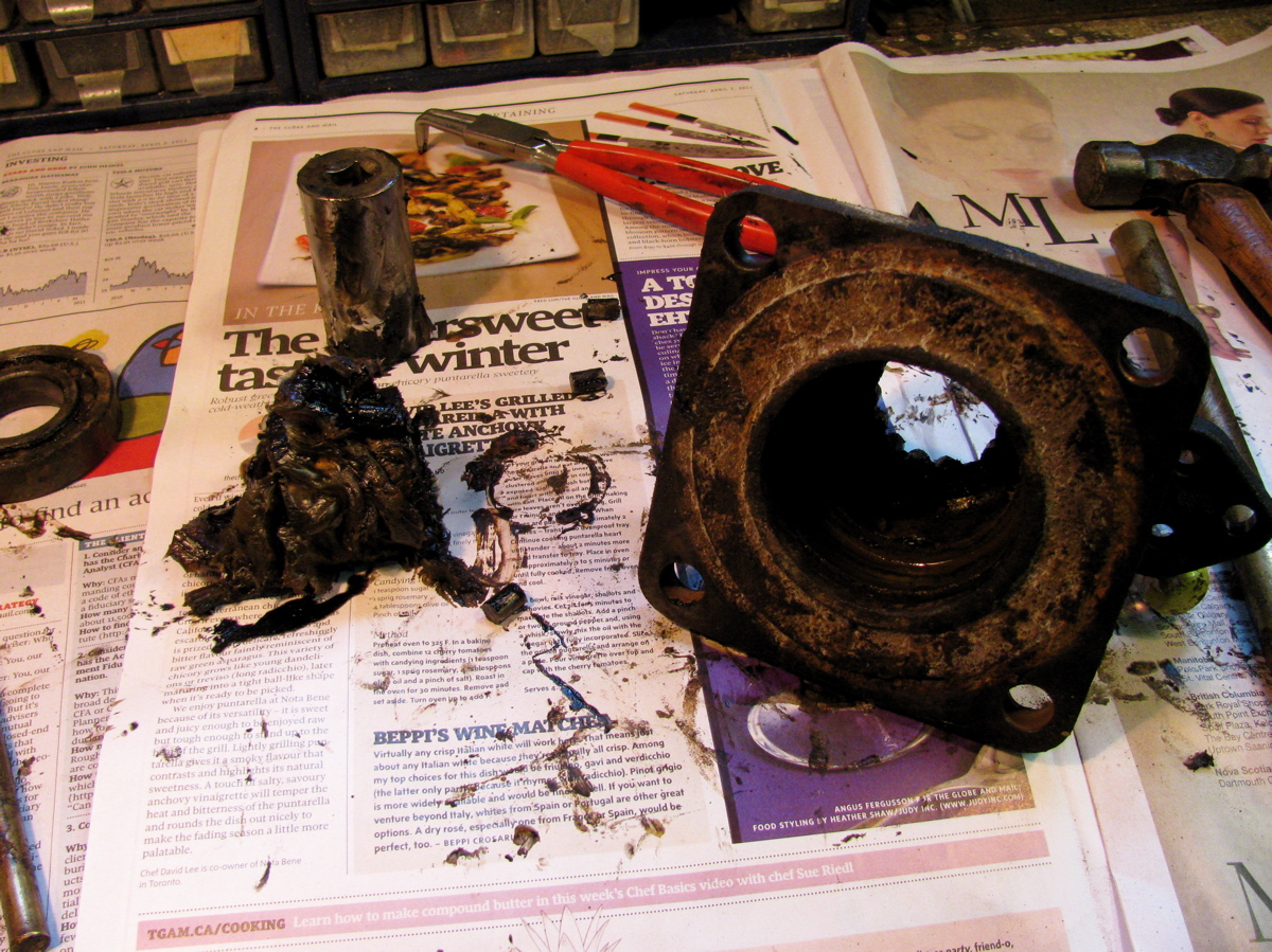 Pretty ugly in there eh? Caked on dirt and some rust. I took the bearing housing to the bench for disassembly.