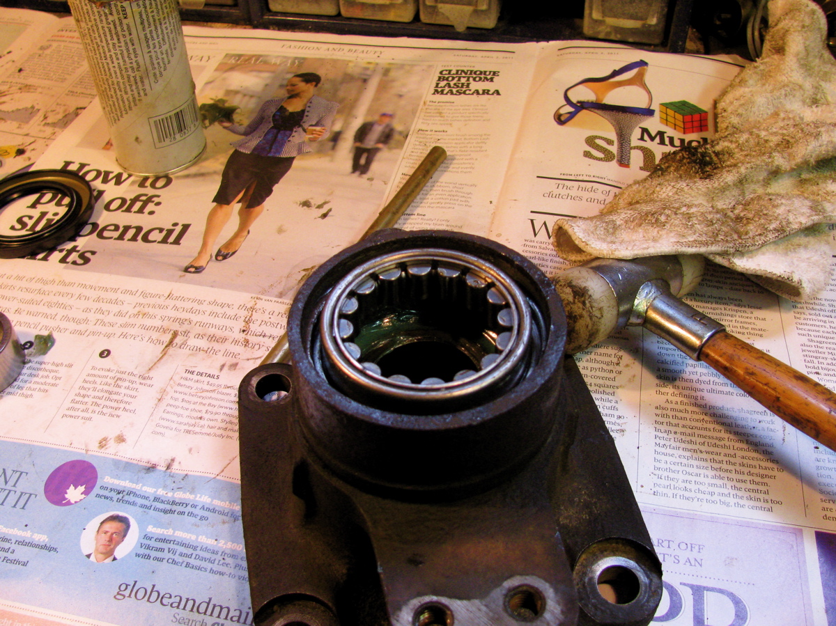 Above pic shows outboard grease seal removed and the inner race of the outboard bearing removed (it just falls out). On the inboard side, after the grease seal is removed there is a circlip to take care of.