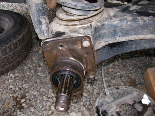 Now remove the 4 bolts (17 mm?) that holds the bearing housing onto the trailing arm, and then the housing should pull right off the stub axle.