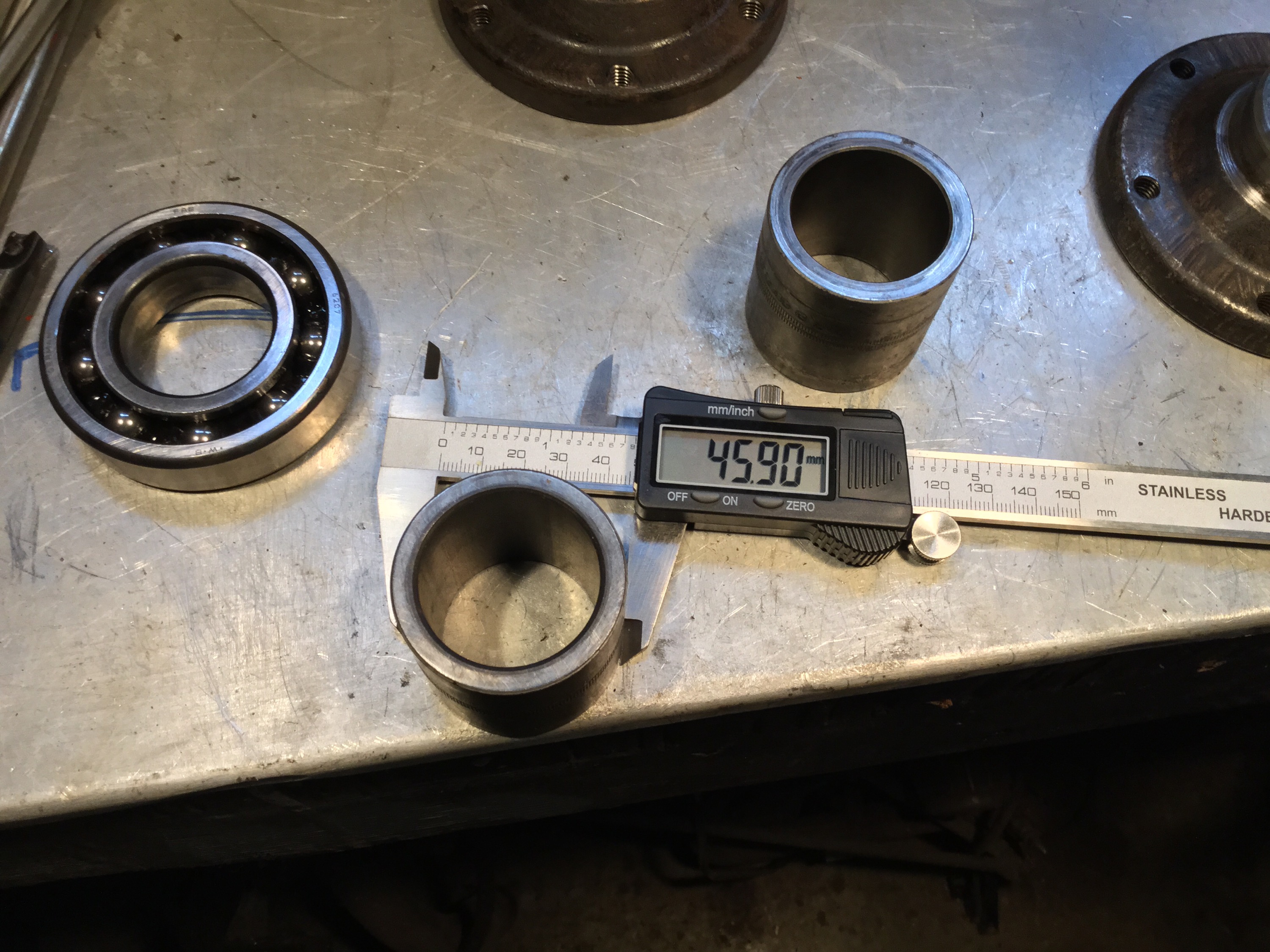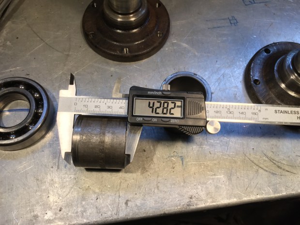After circlip is removed the inner bearing can be removed by driving it out with a brass drift from the outboard side. The spaced sleeve in there between the bearings can be shoved to the side so that you can get the drift onto the bearing race. It took a bit of “drifting” to get the bearing out. If you have a press then you know how to do it better. Once that inboard bearing is out, the spacer is removed and then the outboard bearing outer race can be driven out. In my case that bearing was really stuck in tight. I used an old disk brake caliper piston to drive the bearing out, was a lucky good fit.