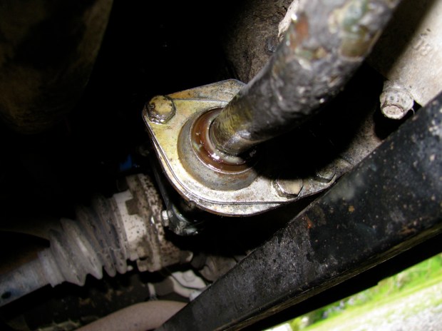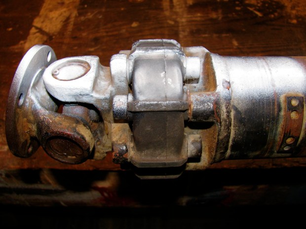Then off with the bolts that hold the giubo to the propshaft. The giubo and joint pull out. The shaft doesn’t look too bad on the end.
