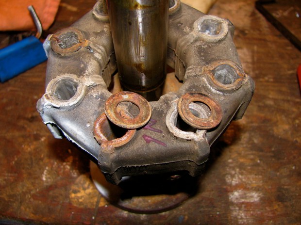 Now remove the vertical from the horizontal between the “ears”. It’s a 10 mm stover nut and a washer on one side, and a 13 mm headed bolt on the other.
