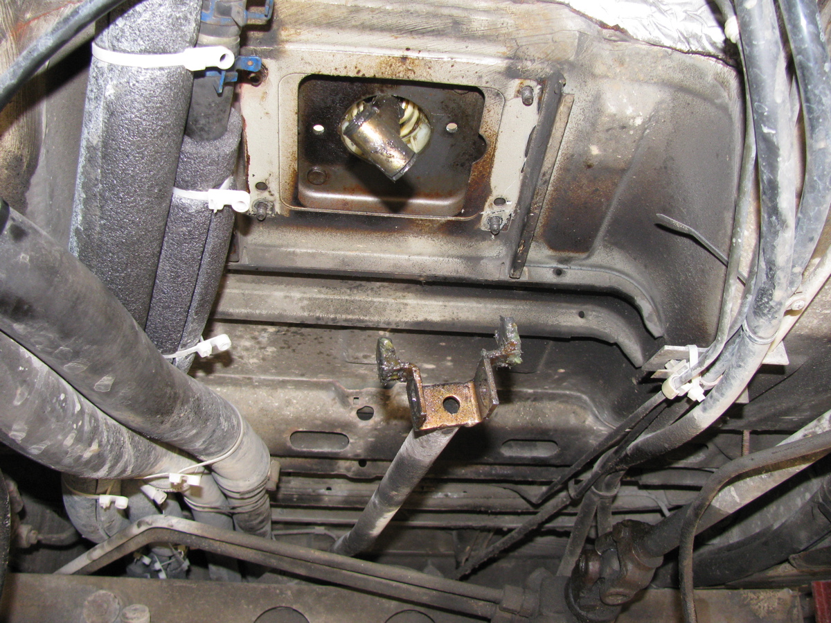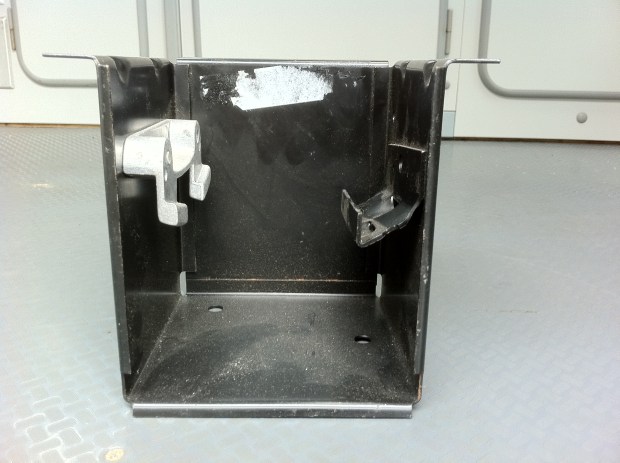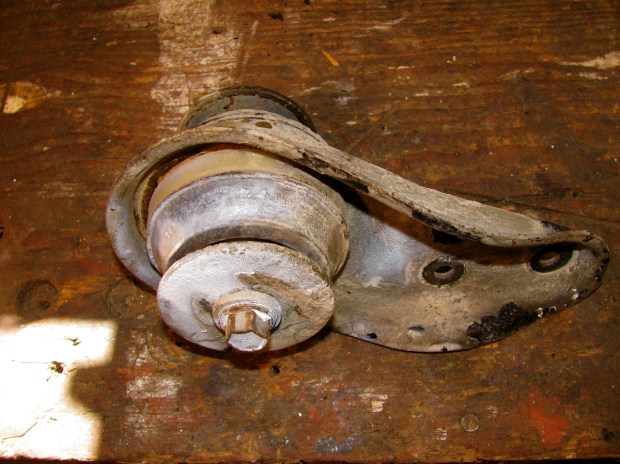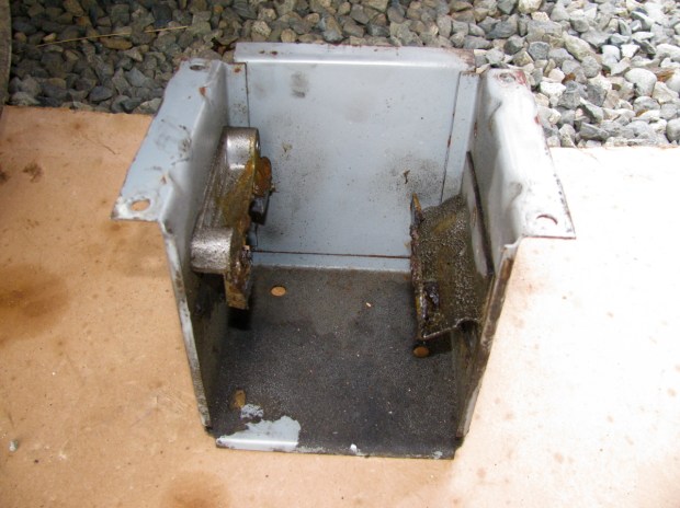 It is hard to get a wrench up to the nut on the top of the rubber mounts, but an angle head ratchet wrench (17 mm) can be squeezed in there, and the other end attacked with a socket. I found that loosening the three 13 mm bolts that hold the bracket to the beam allows the ratchet wrench to get up there easier. One funny thing, the EKTA-like diagram above show those bolts coming in from above, they don’t. So the rubber mounts and bracket were pulled out. Here is the bracket on the bench.