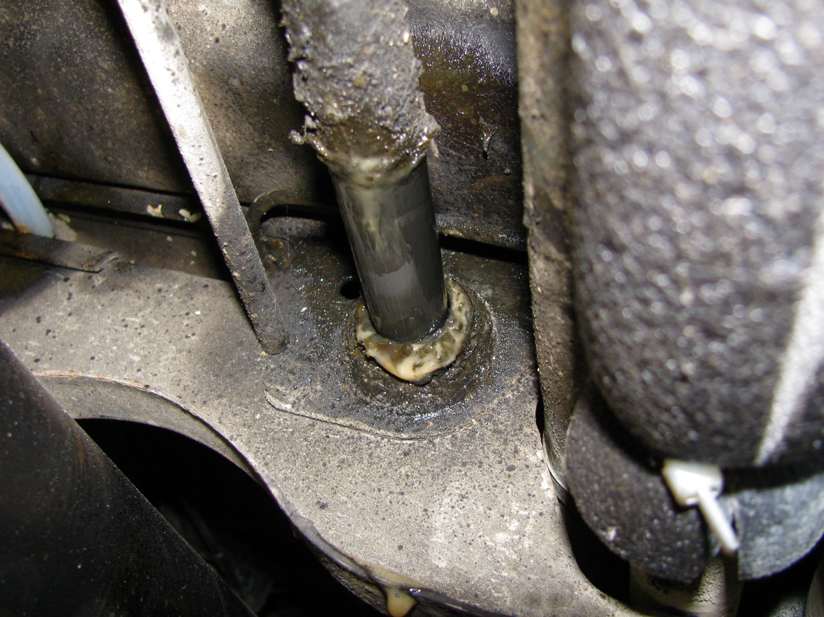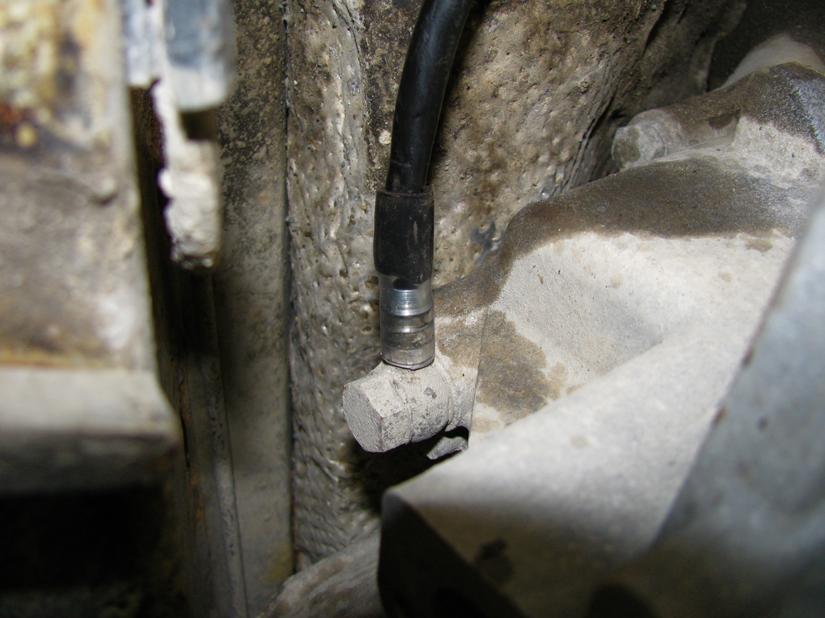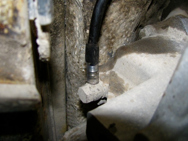 Looks a bit collapsed, saw the same thing with the front diff. mount. The bracket was a bit rusty so I scraped off the rust and slapped some POR on it. While the paint was drying, I had a look at the part of the transmission that was exposed with the mount removed. I found the transmission breather hole which, in the syncro, has a plastic tube leading somewhere higher so that the vent won’t take in water if wading in the van. Sometime in the van’s history the transmission was rebuilt and the breather tube was reconnected to the hose barb on the transmission via a short length of rubber hose. It came off too easily so I used some clear PVC tubing to connect it (heating the stock tubing with heat gun and trying to get it on the hose barb was not a success).