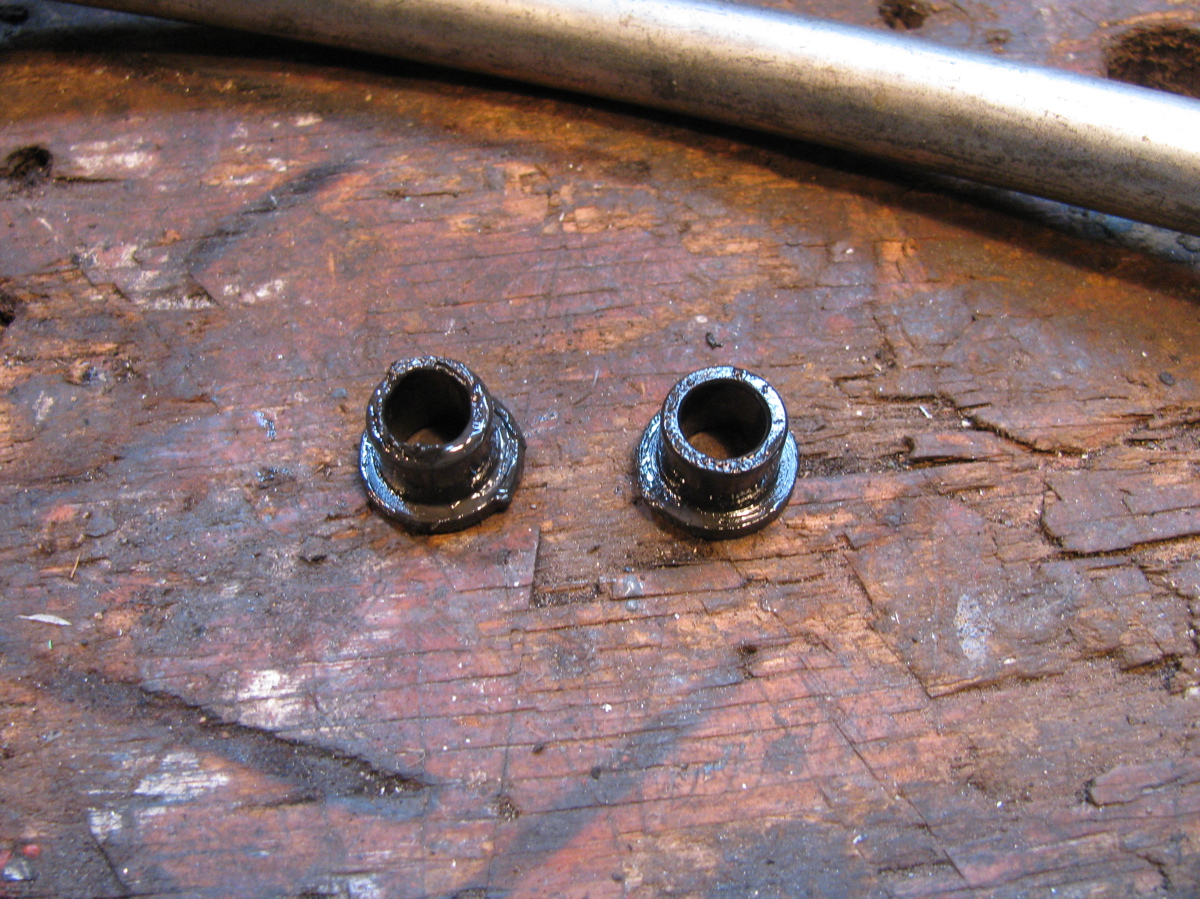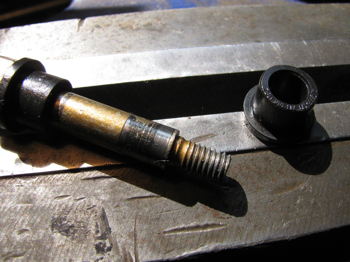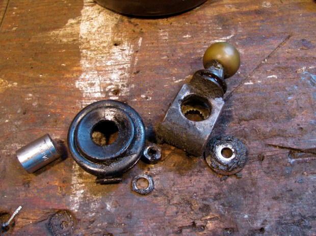 The brown ovoid shaped bushing was packed inside with a mixture of old grease and grit, took a few minutes to get that clean. The roll pin is worn, I think I should get a new one  ( have a spare bit of linkage so I can get the right size at the shop).
