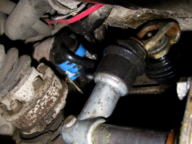Then it’s grease them up and put it all back into the van, with a spritz of Fluid Film. Not really happy about the rubber boot that covers the transmission selector shaft. It does grab onto a ridge on transmission, but outboard end of it doesn’t seem to attach to anything. You can see a glint of exposed shaft in the pic below.