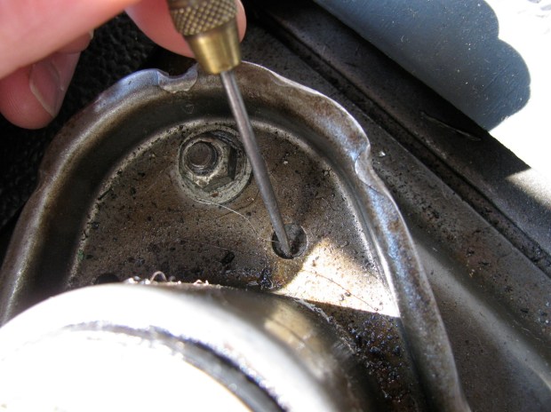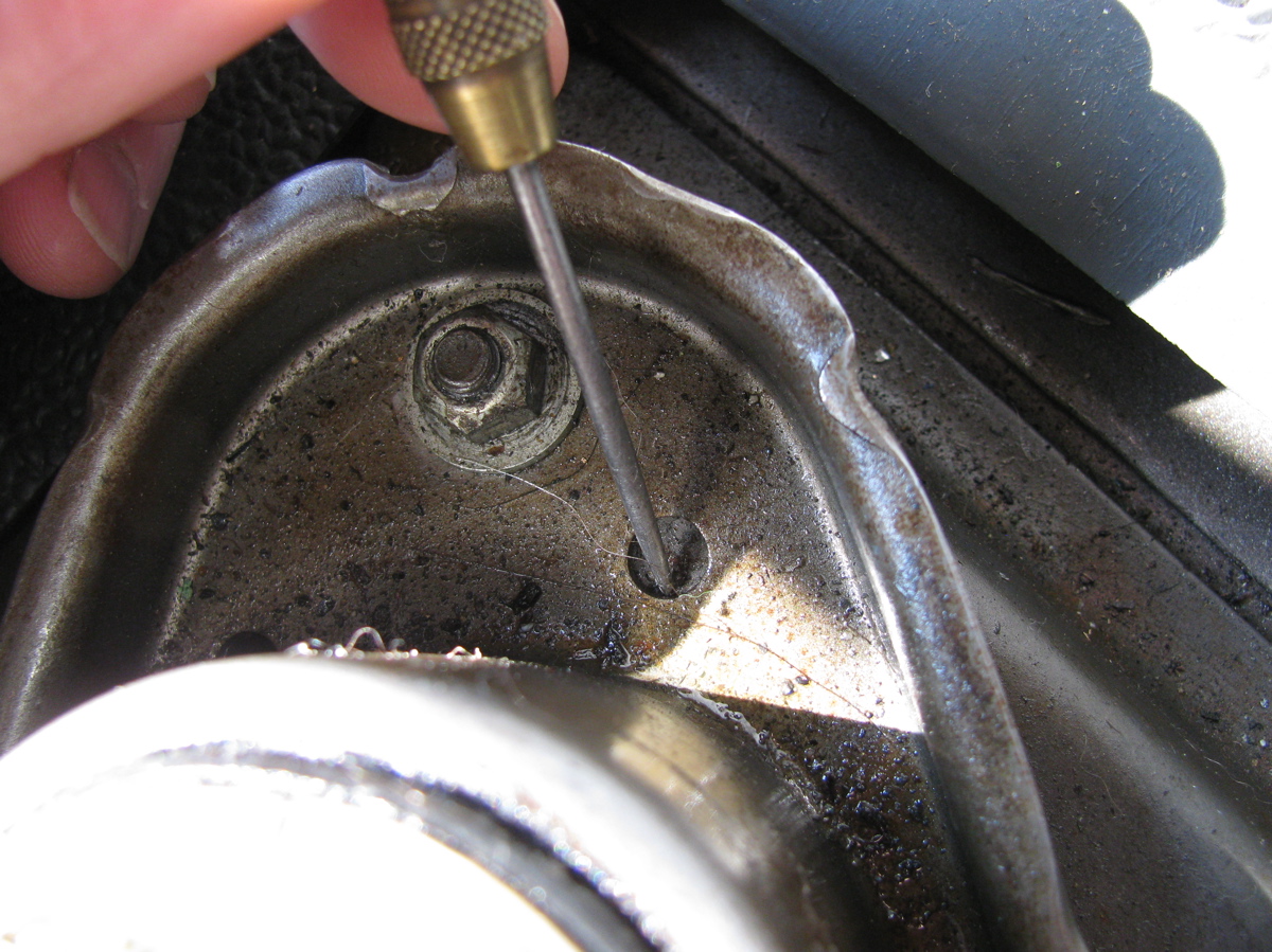 Back to the job, first unscrew gear lever knob and pull off the rubber shifter boot. Then mark the position of the upper plate on the lower plate. I scratched circles through the two holes in the upper plate.