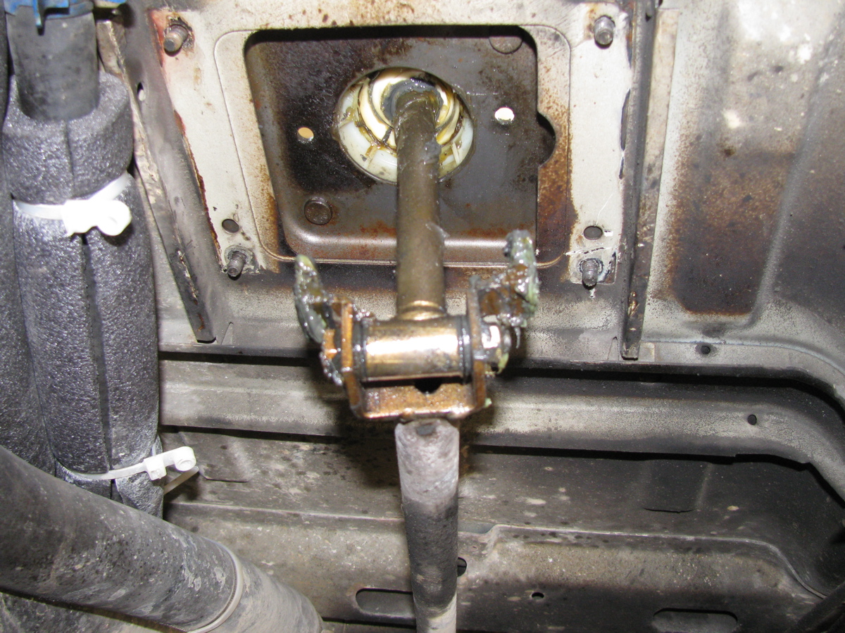 Then under the van to connect the shift lever to the ears using that bolt and bushing arrangement. Bolt the box back on and put the spare tire and tray back in place. Back upstairs and rubber boot and shift knob back on.
