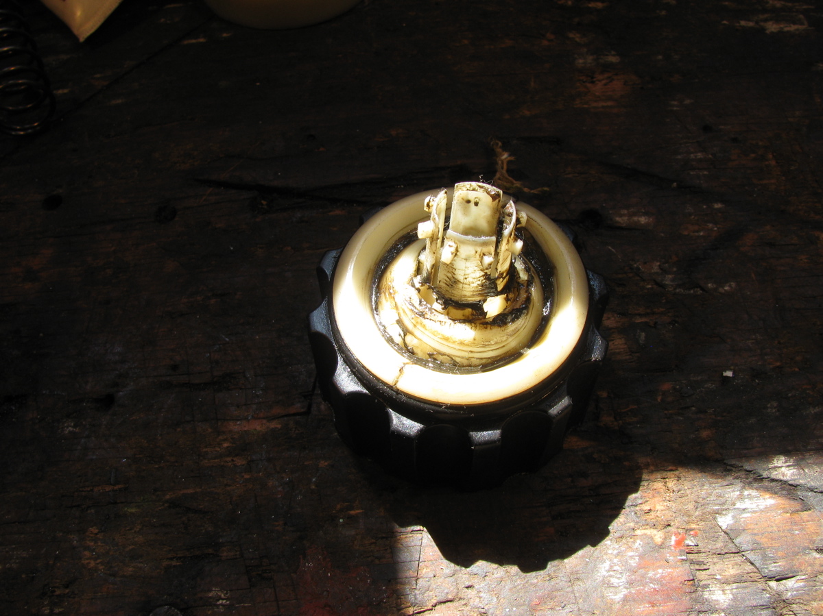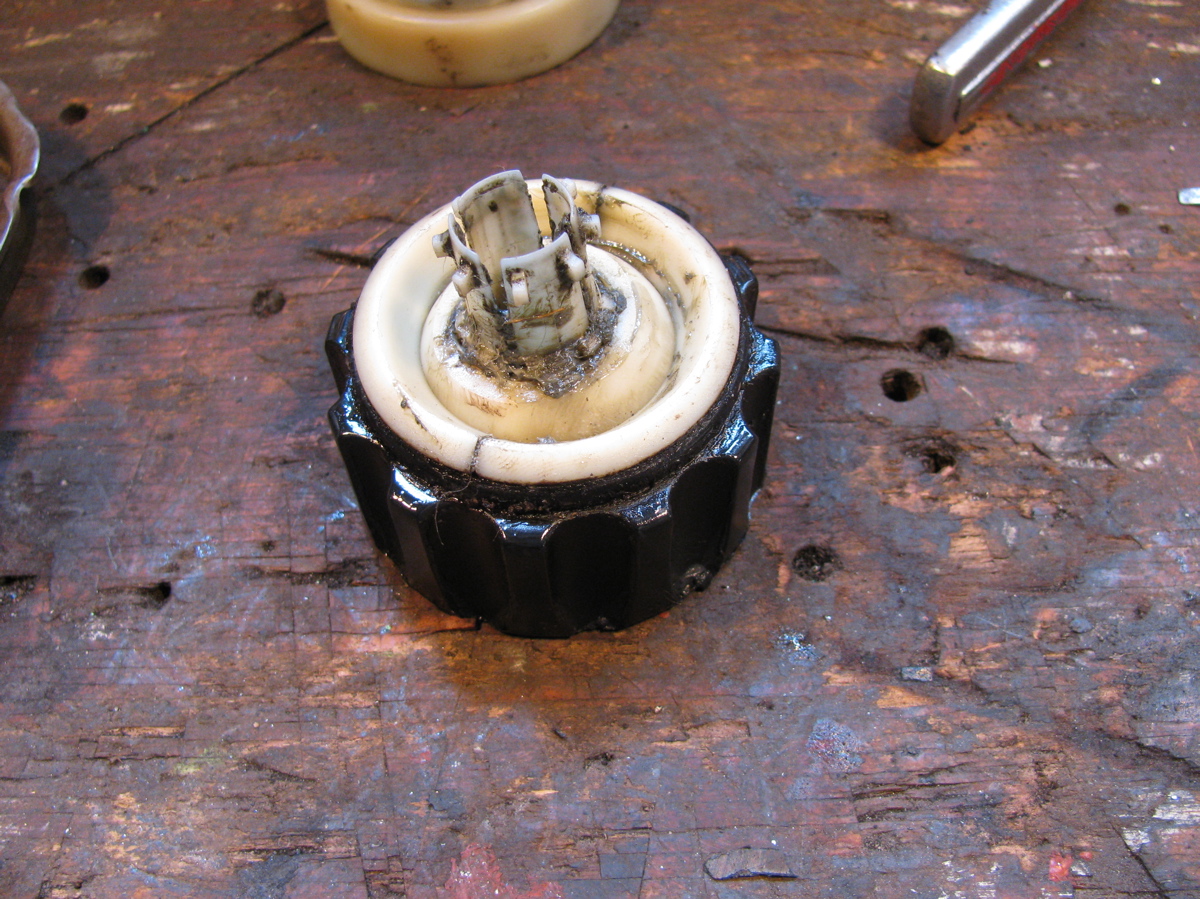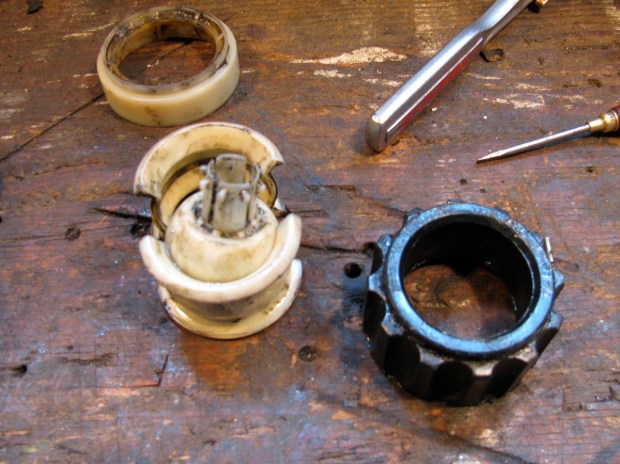 Then the entire inner workings, rubber collar and all, can be pushed out from top to bottom. It might be tight, but palm pressure is enough to do it. Careful not to break the upper plastic.