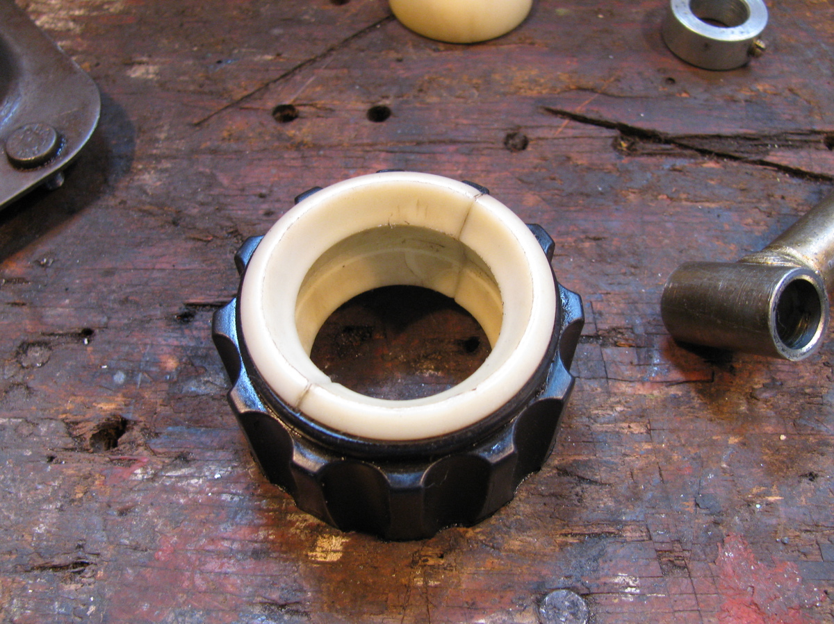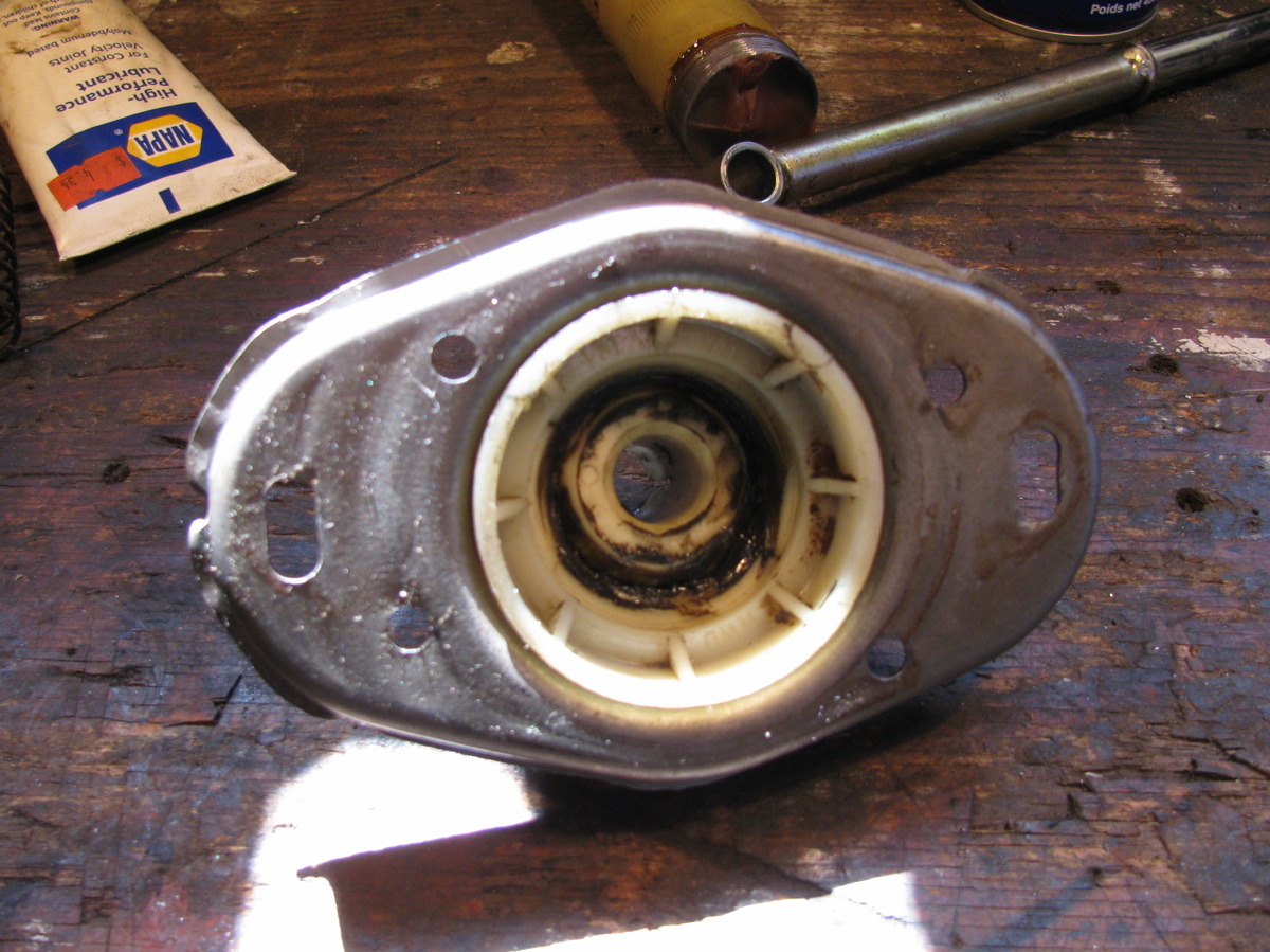 Back to the other parts, now you can remove the two stover nuts holding the upper and lower plates together, you did mark position of the two plates first right? The white plastic collar on the underside of the upper plate is pried out.