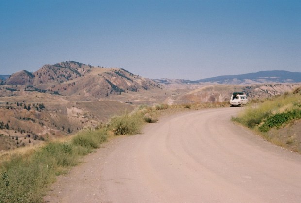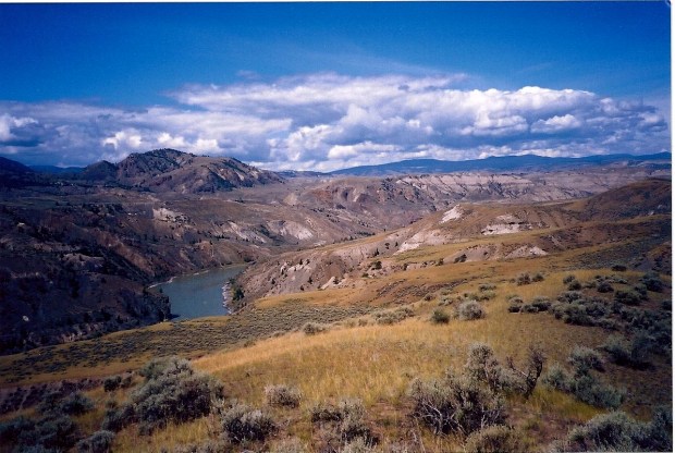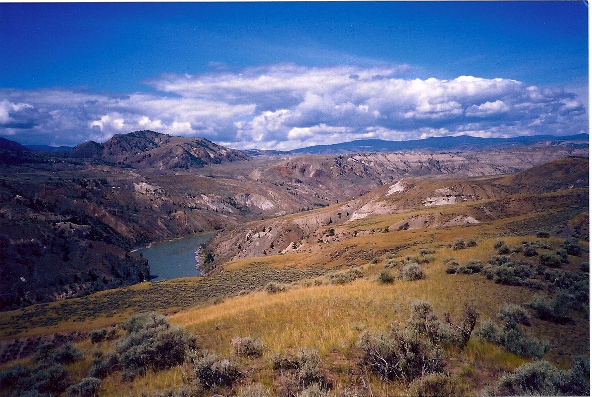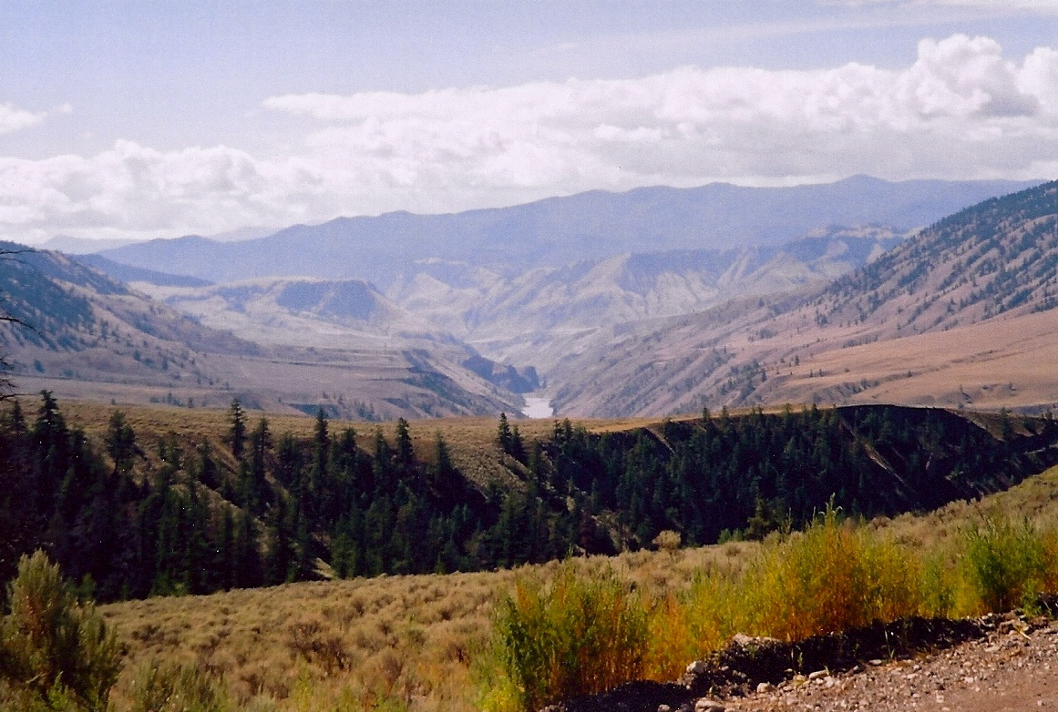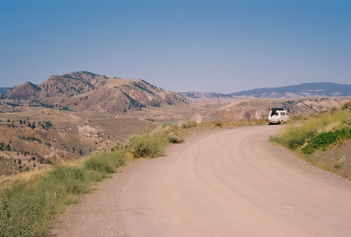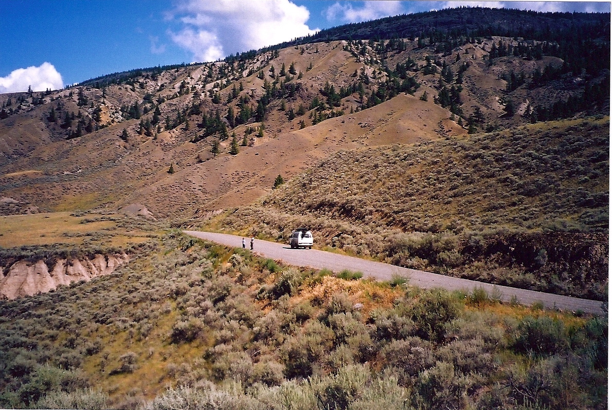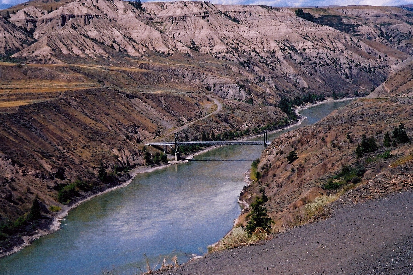 That road goes through forest then down towards the Fraser, steep (25%) and narrow. Once out in the open the road turns north, following the Fraser. The Big Bar Creek cable ferry is down there. Spectacular view across the river, colourful eroded hills on the other side. Follow that road north along the Fraser, sage brush, cactus, dusty roads, rolling up and down until you get to Big Bar Creek.