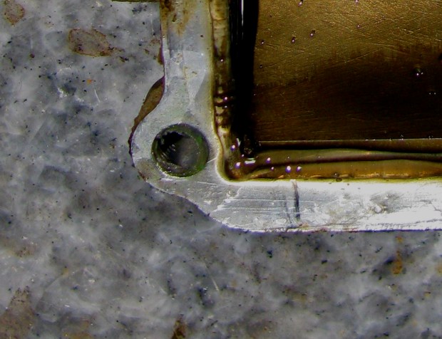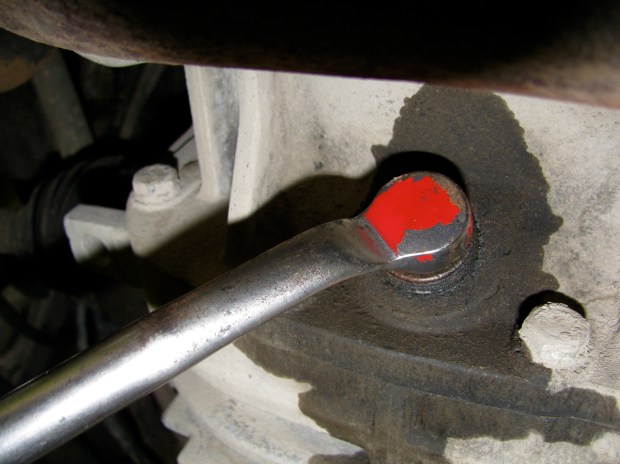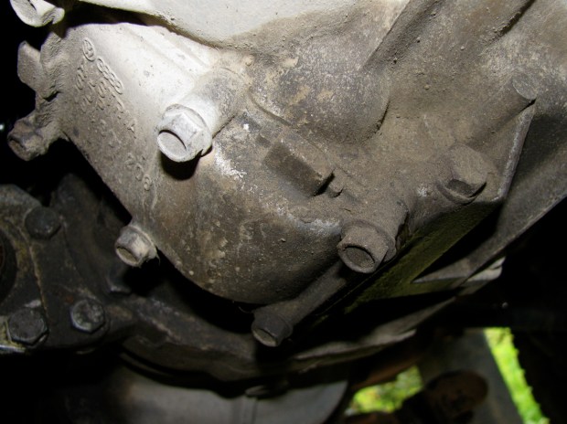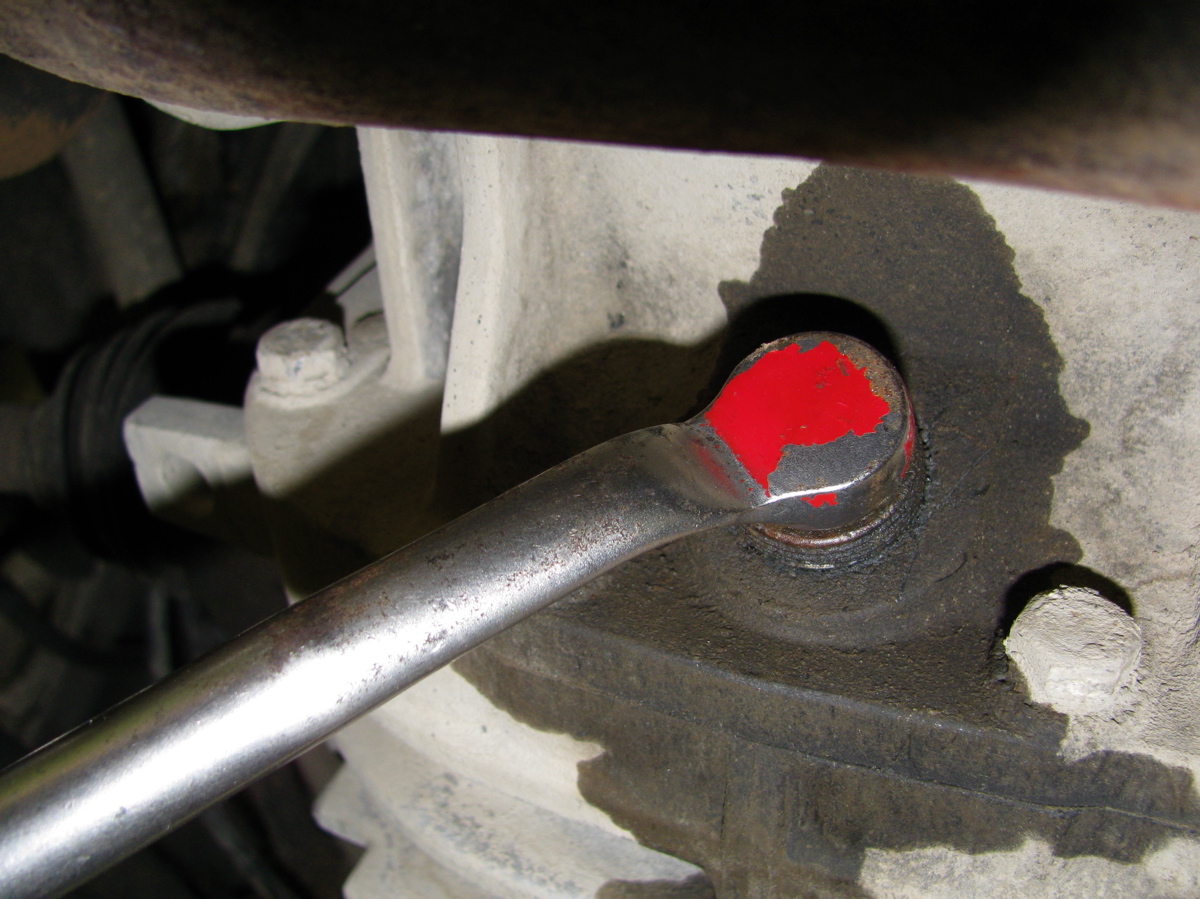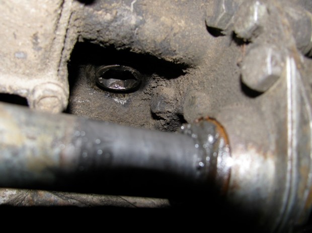 Thankfully the fill port plug unscrewed with no problem. Next, on to the drain plug. The wet spot is the penetrant fluid stain.