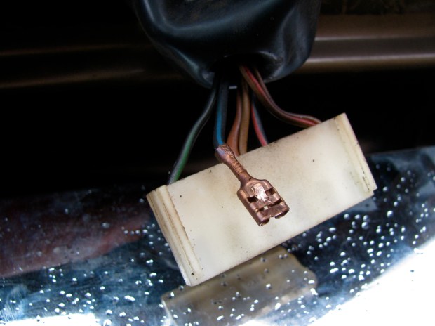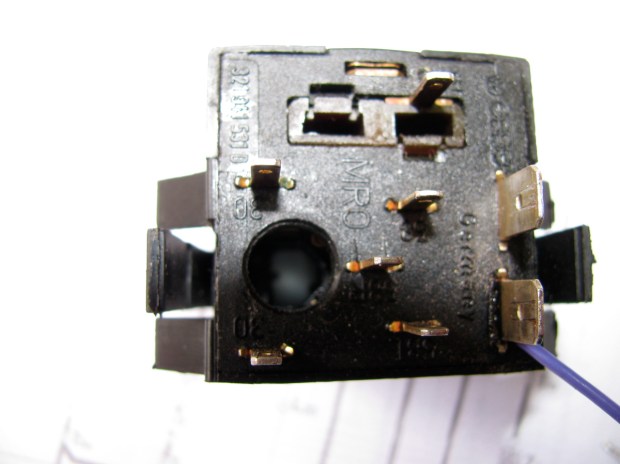 Here is a view of the back of the switch removed from the connector and you can make out the white plastic in the hole. Disregard that purple wire soldered to the spade connector, that was a failed experiment.
