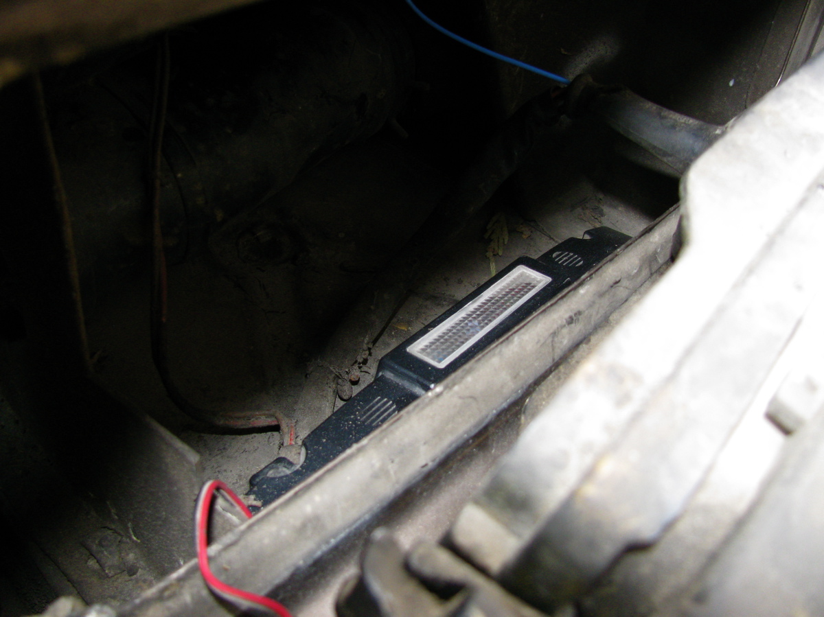 I used a bare bulb white LED and a resistor. The LED fits nicely into the hole in the switch connector and I opened the slots at the base of the hole with an awl so the legs of the LED would fit through. I then could push the LED into the hole and the legs of the LED poked through the other side. I soldered a wire onto one leg and a resistor onto the other. I forget the resistor value at the moment, but you can read the code in the picture. I soldered the other end of the resistor to the black and yellow wire coming into the switch connector. That wire is connected to the X-relay current path, so it get power when the key is on. The purple wire grounds the LED through the handbrake on warning light connecter, the brown wire on that white connector in the picture.