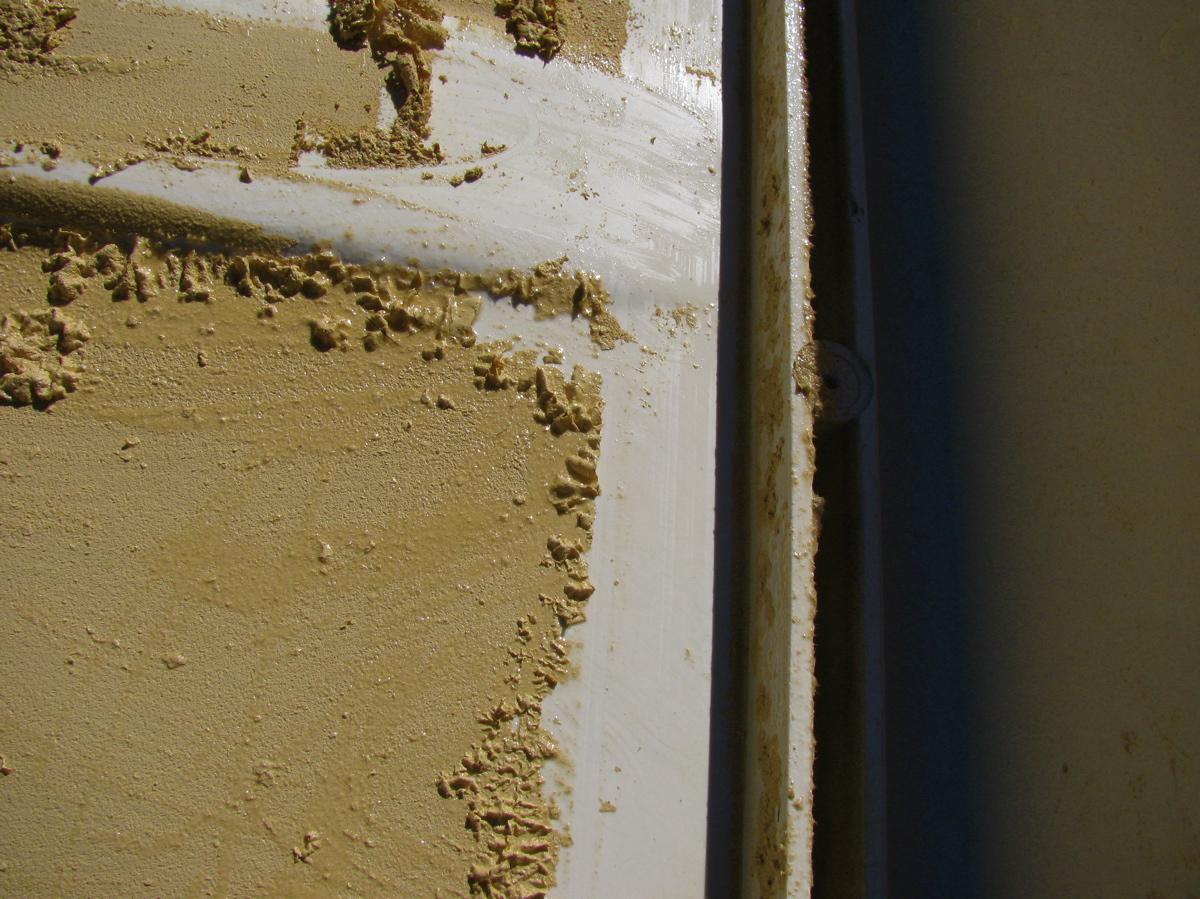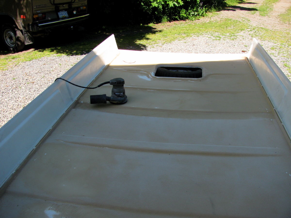 Finally the weather around here has warmed up and looks stable enough to pull the pop top out of the garage and get around to painting it. I power washed it last fall, and did a bit of scuff sanding. I have this notion to insulate the ceiling with some 3/8″ closed cell polyethylene foam so I set about taking the fuzz off the ceiling. I used an orbital sander, which worked well. Then I thought I’d try some paint stripper (had a little bit hanging around), and that worked really well. I’m not concerned about getting all of the tan paint off the ceiling, just the fuzz and around the edges.