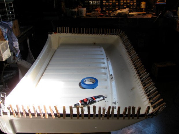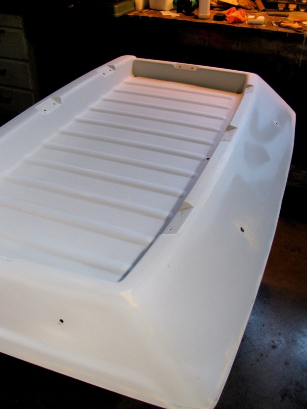 Then I used some thickened epoxy to fill some holes I had in the top. While the epoxy was curing I put a coat of paint on the luggage rack.