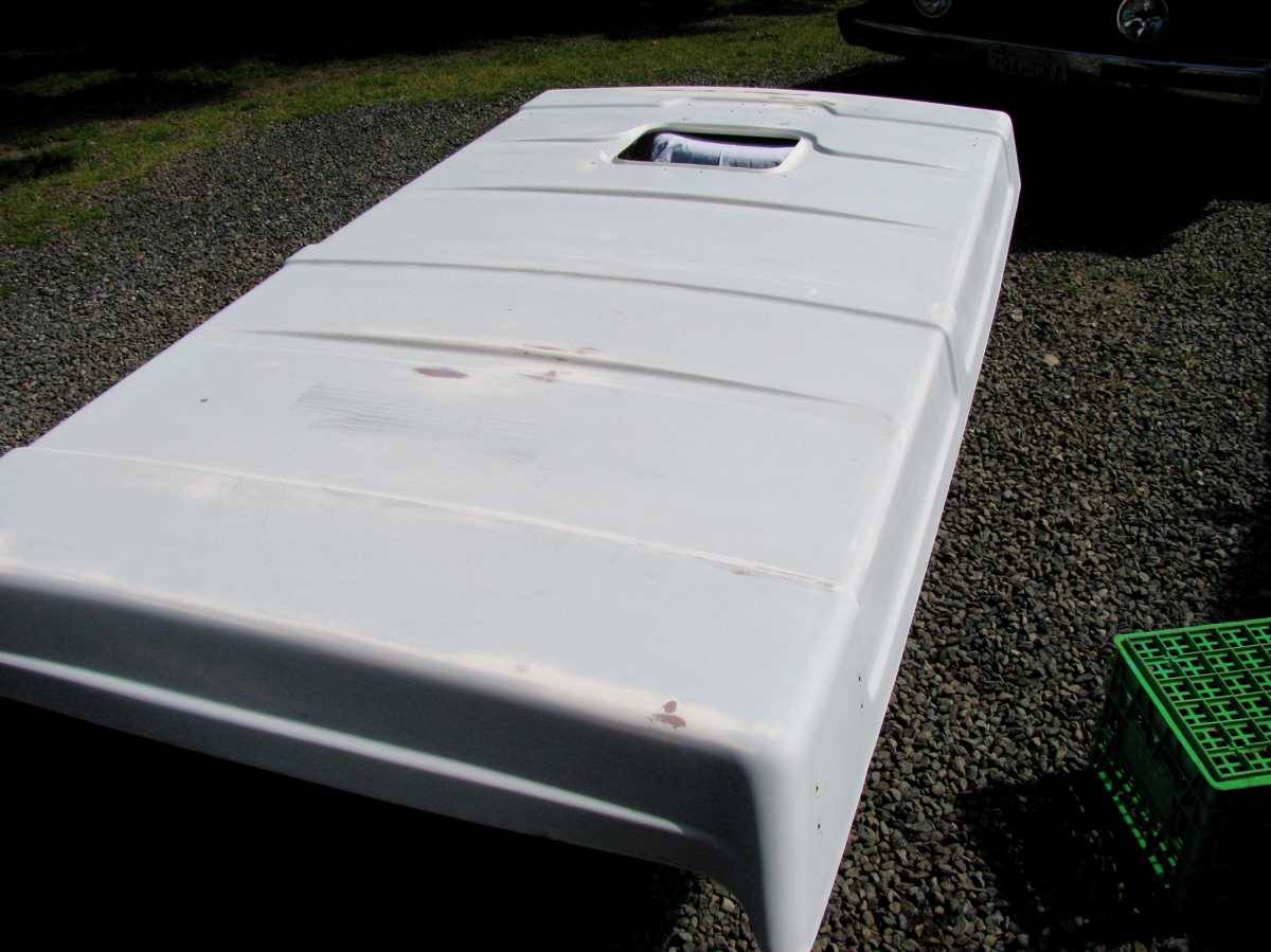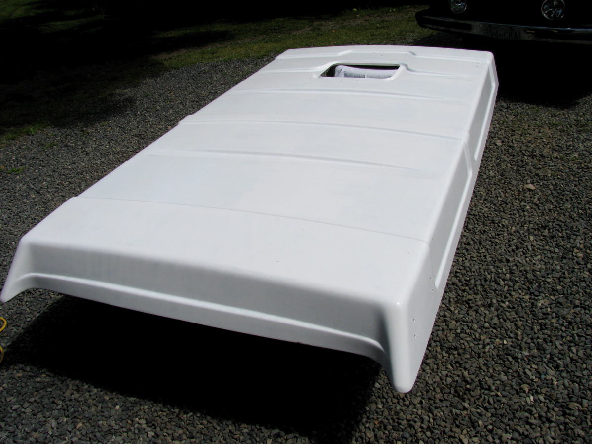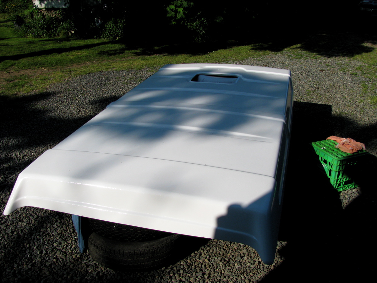 Scuffed up the first coat and put on the second, both the luggage rack and main top. The dust and bugs were out today, and painting white on white in the sun was difficult, almost got snow blindness.