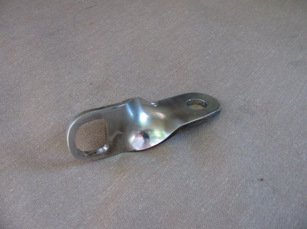 When the pop top was on my old ’82 westy I replaced the stock footman’s loops with some stainless eye straps, 2″ Harken, from West Marine, about $2.50 each. Here is Tiny URL to the catalogue page. I find them much better than stock, easier to run rope or attach bungees. The 2″ size fits pretty closely to the stock holes in the luggage rack. When I put them on originally (7 years ago?) I just had to enlarge the holes in the rack with a 5/16″ drill so that 1/4″ stainless bolts would fit. I dug out an old stock loop for a comparison.