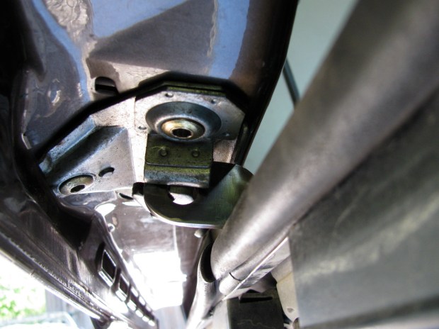 I used wire I had lying around, not conforming very well to any colour code. I did use a little bus, power is on the right, and ground on the left. I mounted the box onto the plastic “bulkhead” that the air intake snorkel connects to on the right hand side of the engine compartment. I tapped into the black/blue power wire feeding the right hand side back up light to provide the signal power for the relay.