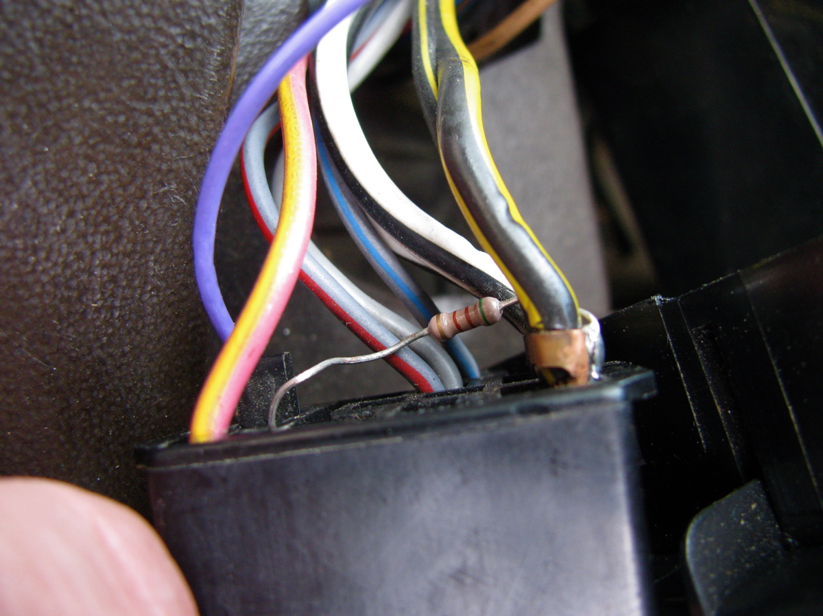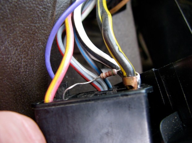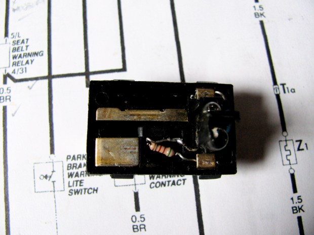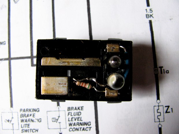 The next kludge is the rear defogger light. There are two tiny little bulbs inside the switch, one to light up the tiny amber dot on the side of the switch when the defogger is on, and one to light up the switch when the headlights/running lights are on. The latter was burned out in my switch. I pulled the back of the switch off (careful, springs and one ball bearing inside), and I put in a LED instead of an incandescent bulb. During the process I broke a little plastic shield that prevents the switch illumination light from also lighting up the little amber dot. One of the pictures shows the shield off, I glued it back on before reassembly of the switch. The leads of the bulbs in the switch are connected to the brass trace by simply being tucked under them. You can pry the trace up and slip the lead of the new bulbs under, then press the trace down again. The resistor can be tucked into a recess in the plastic. I have the negative leg of the LED tucked under the brass at the bottom, which is the “31” spade on the switch, and the positive leg curves up (covered in blue heat shrink) to tuck under the brass at the top, which is the “56b” spade (powered by the headlight dimmer switch). The switch goes back together pretty easily.