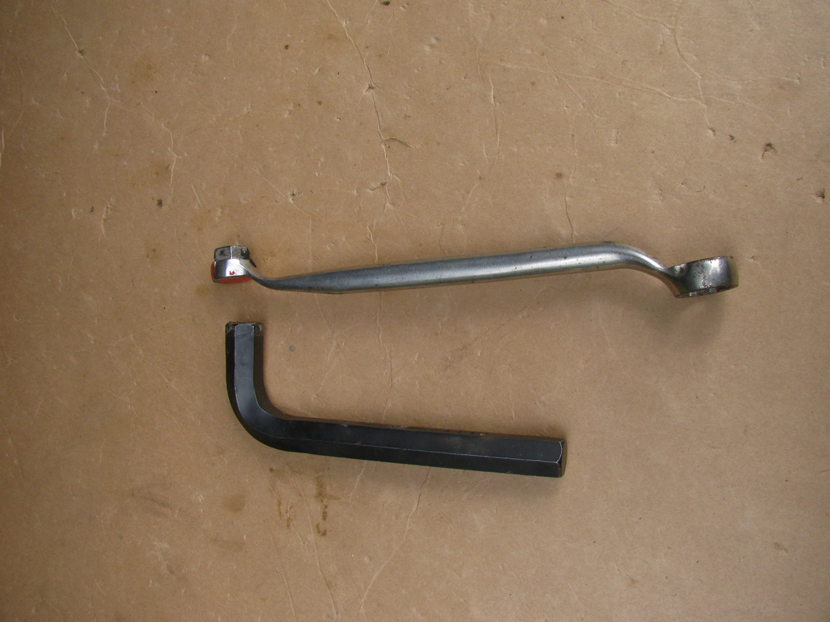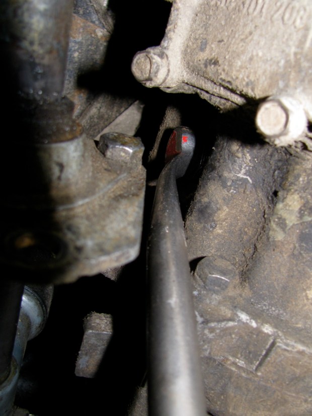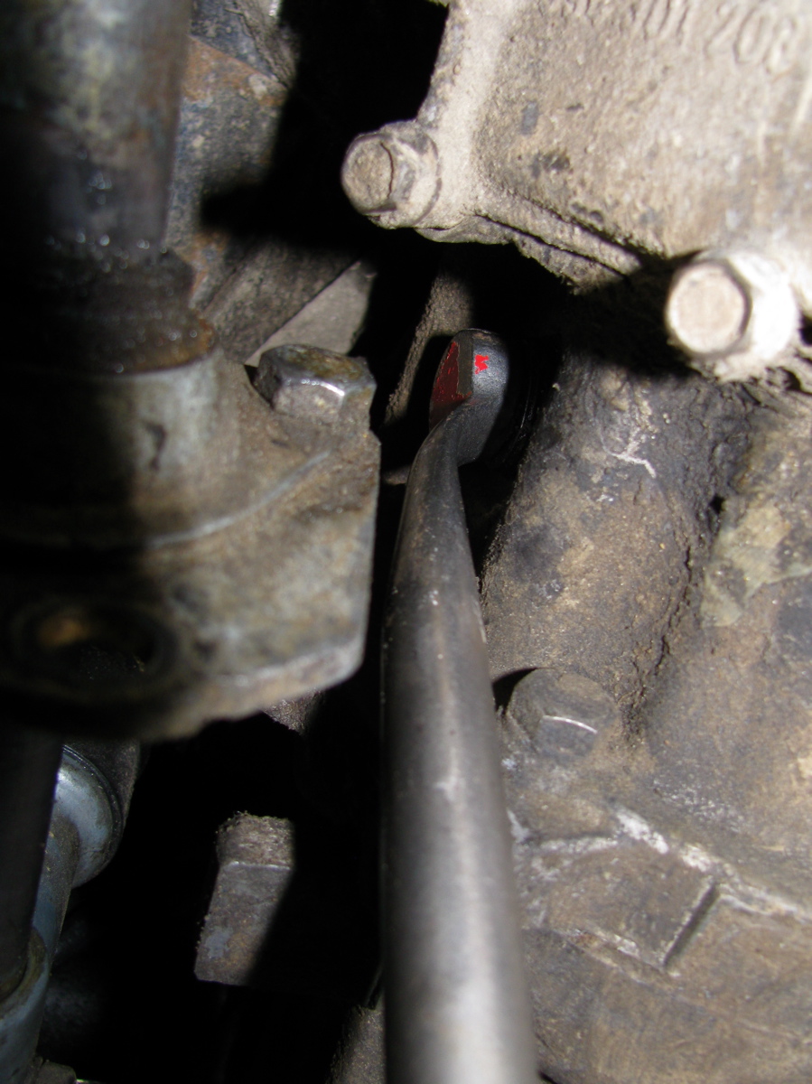 And more obvious advice: clean out the hex recess in the plugs with dental pick, toothpick, compressed air, whatever. Ya gotta have the wrench make a good fit. I squirted penetrant/rust buster on the plugs, more out of habit than expecting that the damn stuff actually does anything. Next pictures shows the fill plug (shift linkage still up in place) and the wrench in in the plug, riveting story eh?