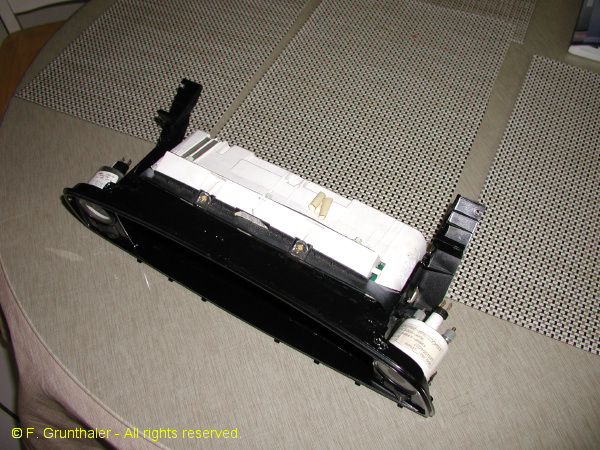 I’m using the wiper (controls the MFA) and turn signal stalks (controls the cruise control) on the steering column from the 1995 Passat GLS 4-cylinder. Here in the cluster, the temperature and fuel gauges are combined, with separate speedometer and tachometer. The warning light group contains the typical diesel functions. There are two unused light ports. I’m doing transfer logos for them and adding my two color (red/green) LED’s. One of the lights monitors the radiator fan speed (green for low, red for high). The other follows the auxiliary lights with green for Fog on and red for the driving lights. The MFA monitors among the standard features, the engine oil temperature, the average fuel consumption, the instantaneous fuel consumption and the external air temperature. This LCD screen also displays the digital clock.