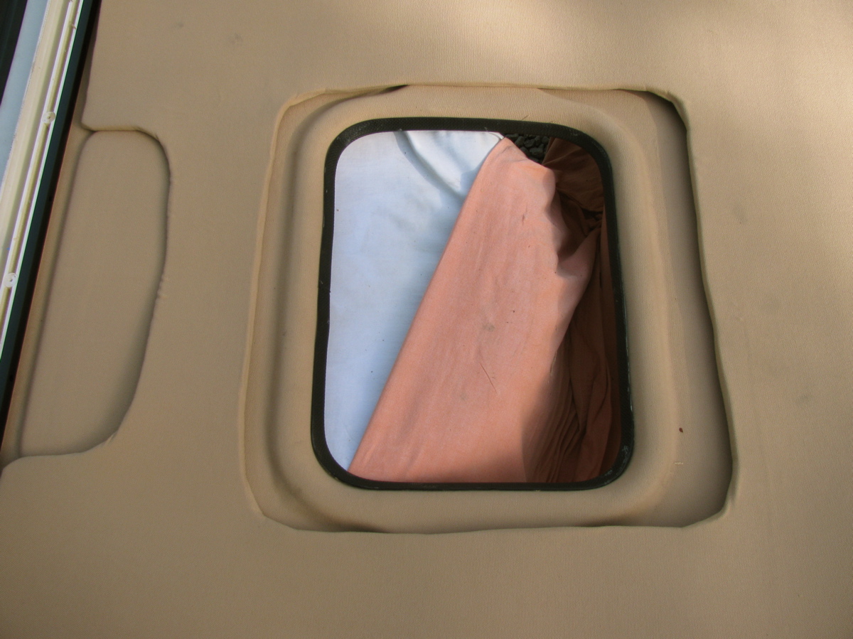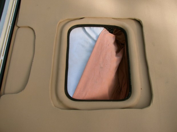 The difficult decision was how to treat the skylight, latch, and pop top strut attachment points. I decided to cut generous openings in the foam and then cover the exposed ceiling with the same polyester fabric I used to cover the foam.