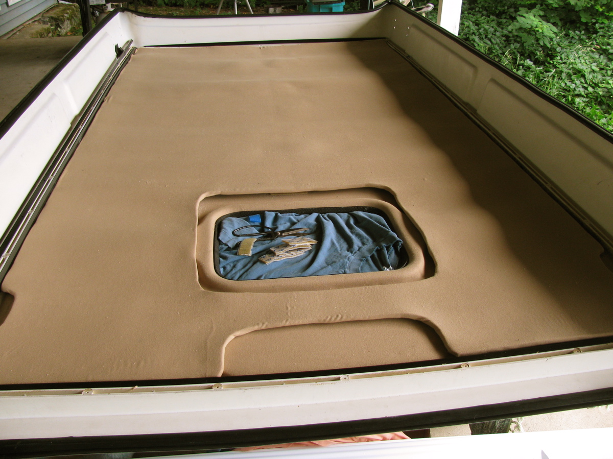 Well I’ve finished my experiment with trying a new kind of pop top ceiling treatment. An earlier post showed how I had stripped the old worn flocking off the ceiling and I had the idea of attaching a closed cell foam ceiling treatment. I did not want to glue the foam directly to the top, but rather have it removable. What I ended up with is not what I had envisioned, but isn’t that often the case?