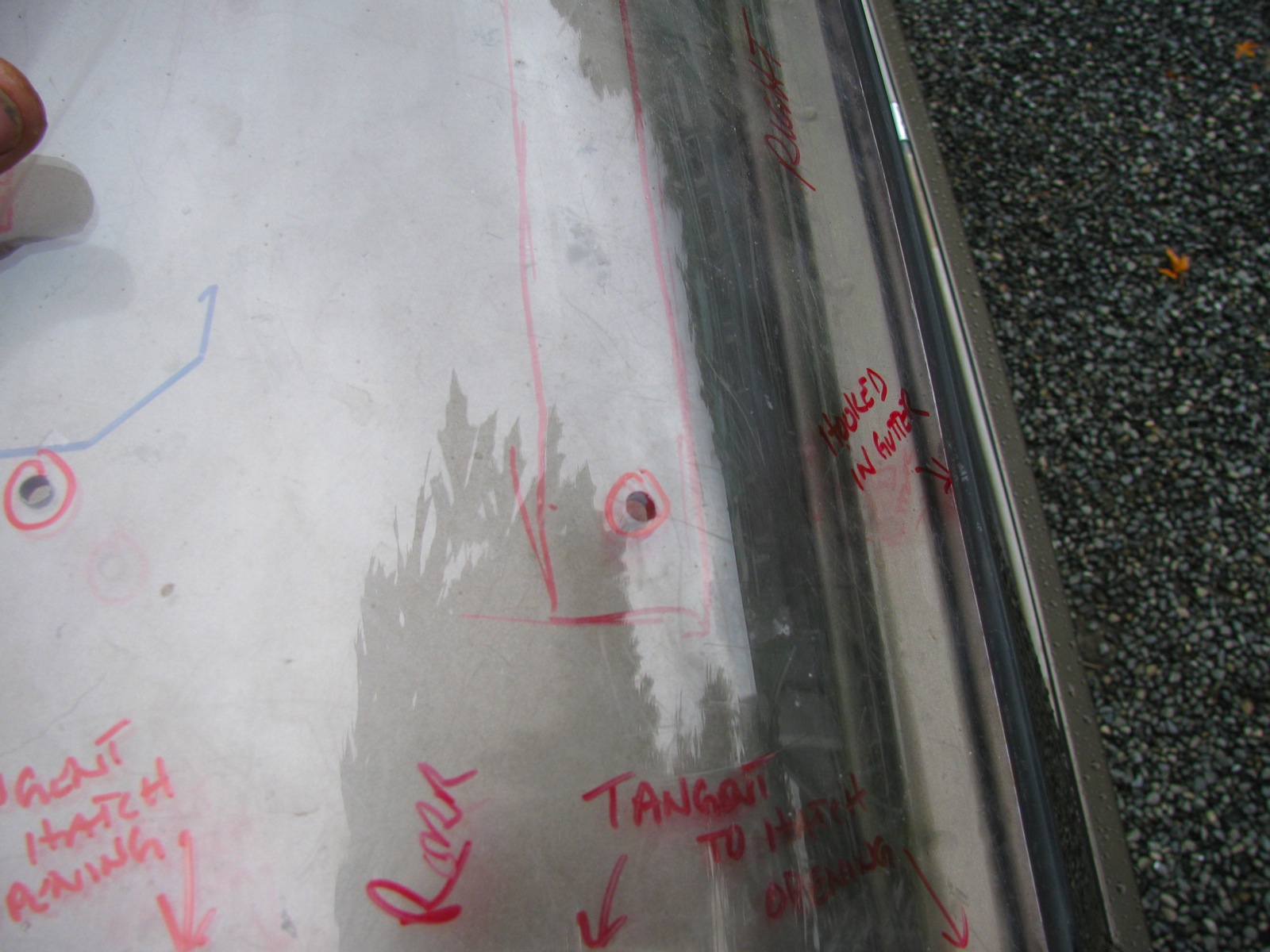 I marked out the hole locations on the roof and drilled them. Made the holes oversize a bit, about 3/8″ diameter. I admit to dicking around and procrastinating with this pop top install project, but now that I have actually removed a little metal from the roof I’m committed.