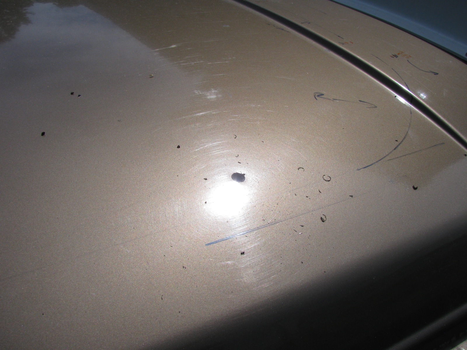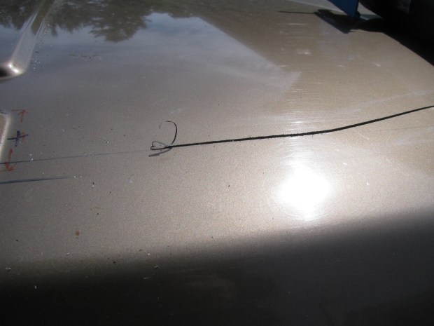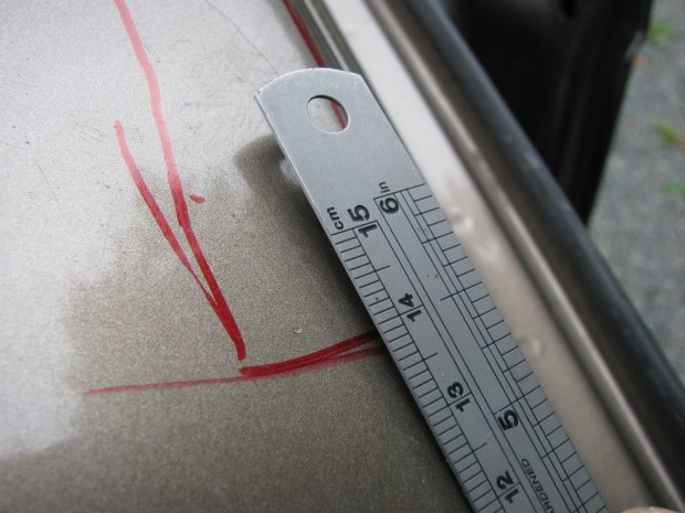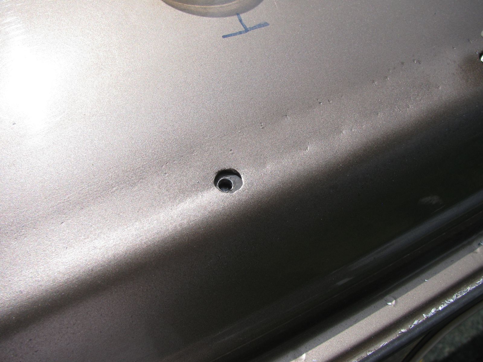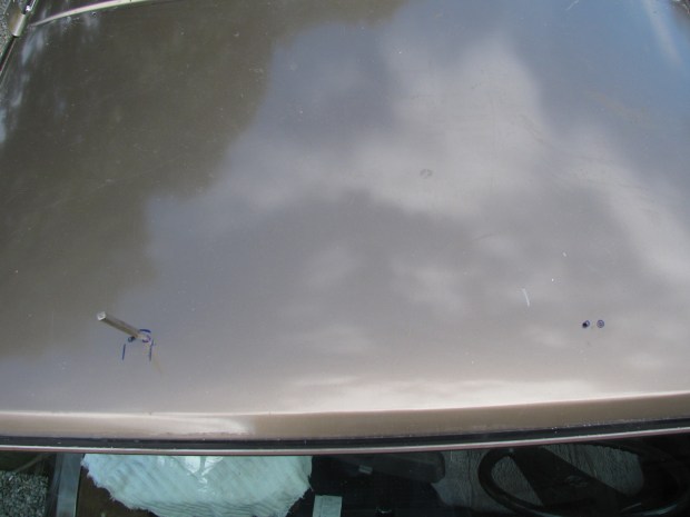 Then I hammered down the metal where the hinge sits, just a little bit so that the hinge sits vertical by itself. I did a nicer job on the left side than the right which was my first attempt. I scratched the paint on that side and had to use some touch up paint. Added insult to injury was the paint spattering.