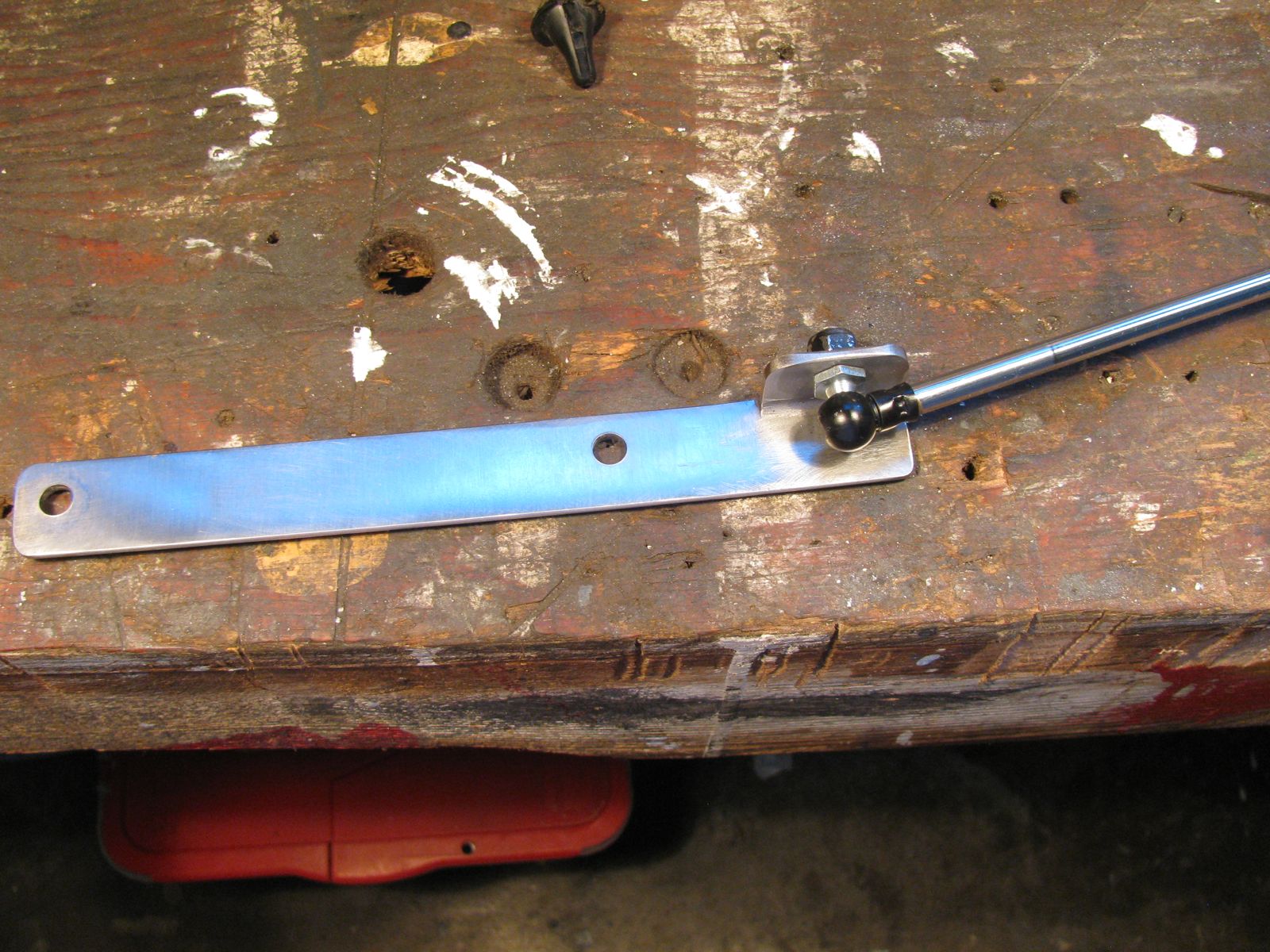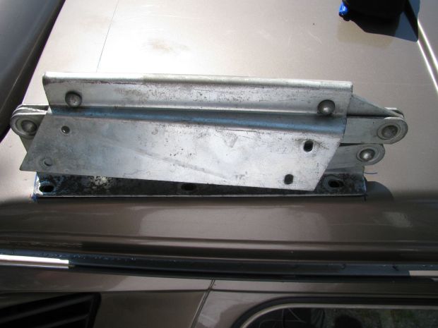 Below is one on the rear hinge. There is a black steel strip underneath the hinge base (barely visible) which is the tapped backing plate I will be using when I attach the hinges to the roof of my syncro. I have not angled the tab where the ball end is screwed on, Jack Bombay’s kit has it angled towards the tent a few degrees, I forgot to do it until I saw this picture. But the lack of angle does not seem to make any difference. Get the idea that I was tired of this little project?