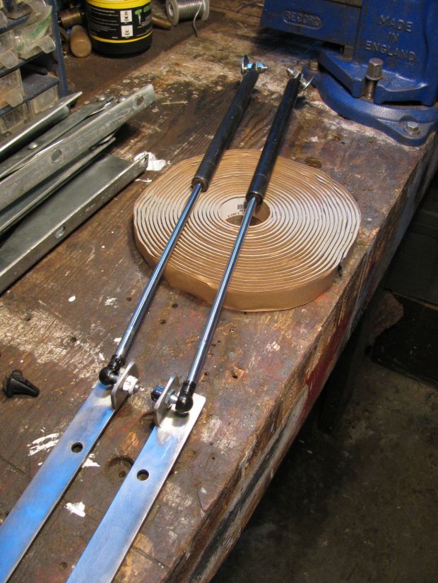 “Jack Bombay” makes a great kit for attaching gas charged struts to the pop top lifting mechanism to help lift the top. I have helped install 2 of his kits onto friends vans, and I recommend buying the kit from him. But, a friend gave me 4 ball end attachment bits and I had some old but still fairly strong rear hatch struts, therefore to save face I had a go at making my own set up. All I can say is if you don’t have a welder, then it is really not worthwhile doing it. I made mine from stainless steel angle, hacksaw, grinder, belt sander, files, and sweat.