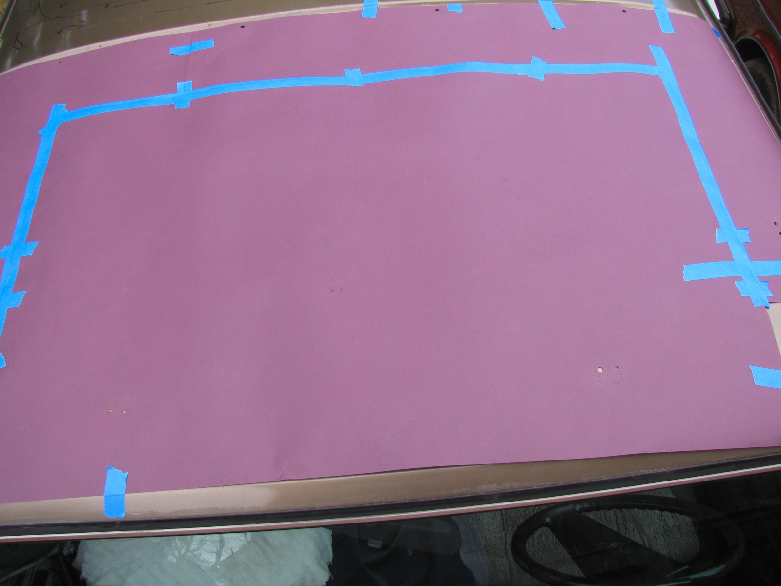 I cut into the headliner in the area where the roof will be cut out. I had to remove 2 wire supports and some of the glued on insulation. I should have worn a dust mask, the fibrous insulation is a bit dusty. Be sure to leave a good amount of uncut headliner at the perimeter so you have lots to play with when finishing the cut edges of the hole. Looks like I am going to make that hole tomorrow.