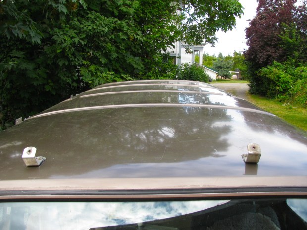 I thought that installing the threaded backing plates would be a pain, but it turned out to be very easily. I used double sided tape to stick on a bit of aluminum flashing to the backing plate so that I could maneuver the plate up inside. I could stand on a box outside looking through the drilled holes and reach around in the van to move the plate into position. I had the notion that I could squirt some caulk in the drilled holes so that the plate could be stuck onto the inside surface of the roof, but as it turned out the plate wedged in tight and doesn’t move out of position.