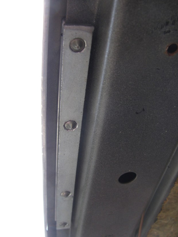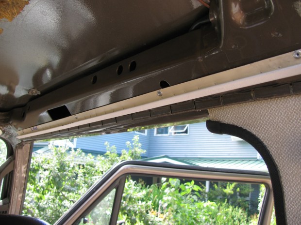 Then I pop riveted in place the ledger strips that holds the front headliner in place. You can see how it sits over the welded in fabric headliner attachment strip. It’s a short one on the passenger side and stops partway along and above the door upper track. It lies at a slight angle.