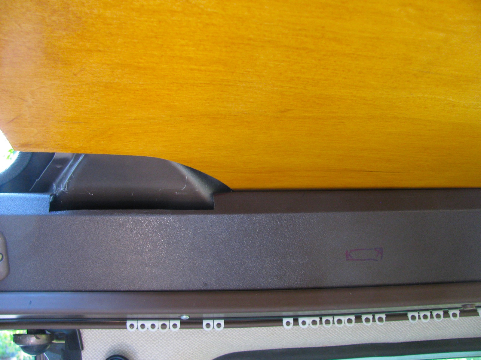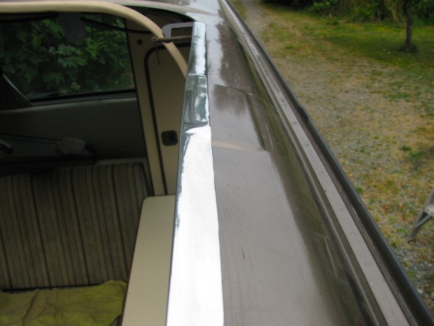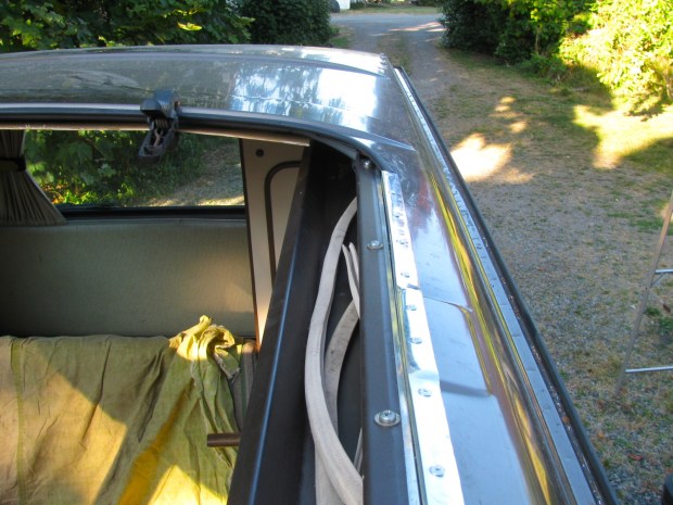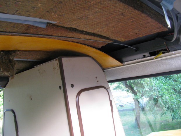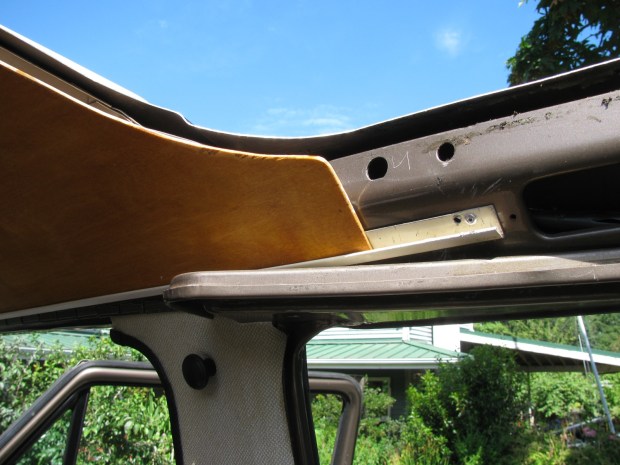 And on the driver’s side the strip is longer. In the westy, the strip holds up a narrow bit of headliner between the kitchen trough and the downturned edge of the roof opening.