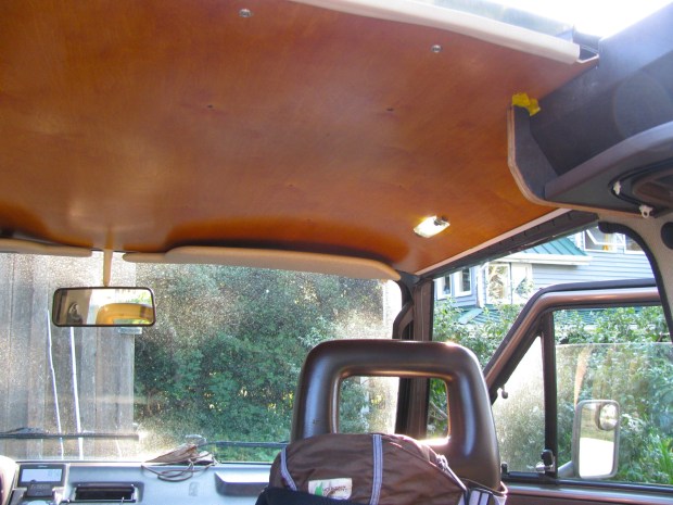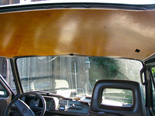 After all my dithering, I finally did it, I cut the big hole in the roof of my ’86 syncro. But before we get to that I had to finish the plywood headliner for the front section of the van. Yesterday I gave it one coat of Sikkens Cetol 1, an oil/varnish finish. Today I traced out and cut it to shape. Then I rubbed it down with fine steel wool and applied another coat of Sikken (this time with a rag, as if applying tung oil). Sorry about the pics, they don’t show the colour right. Notice I cut out holes for lights on both sides.