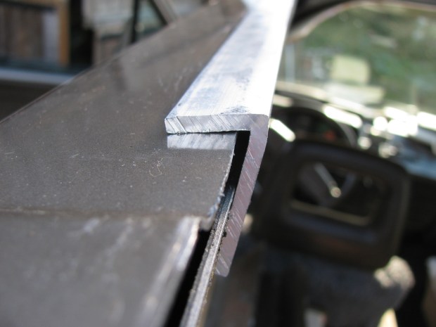 This angle will be pop riveted into bot the box section and the roof. Another aluminum angle will be pop riveted to the vertical part of this to provide the support base for the pop top lifting assembly and the bed extension support. More on that later.