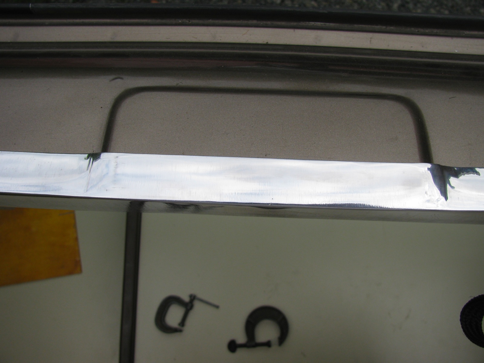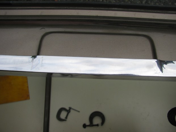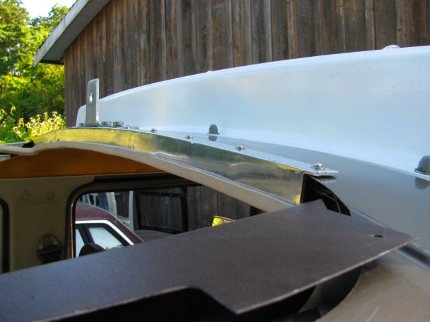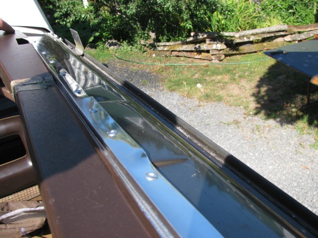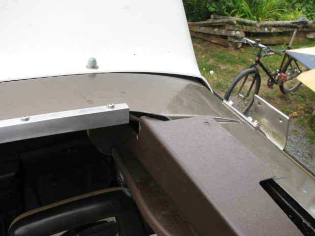 Of course I practiced with the U channel in the wrong orientation then proceeded to do the real bit the same way. Grr, had to straighten it out and re-do. But I got it done, drilled holes for some stainless sheet metal screws and a cut out around the latch. The plywood headliner comes to the rear edge of this channel, and I think will be gussied up with some edge moulding stuff, or something.