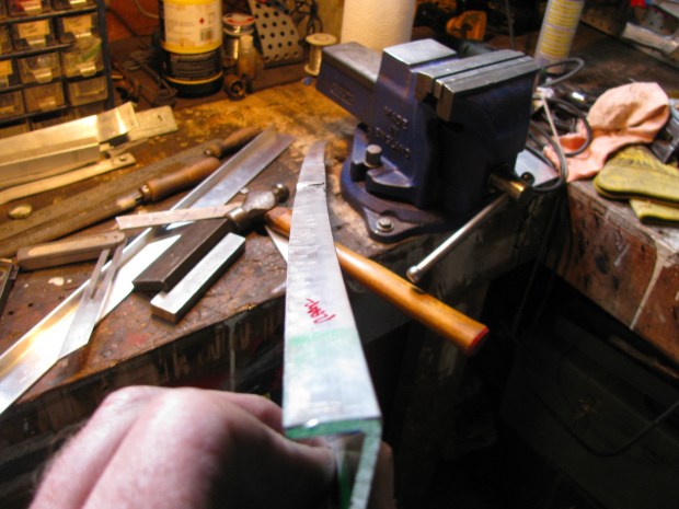 Bending the angle to less than 90 degrees stretched the metal where I hammered, so the piece came out slightly curved. No big deal, it will pull back into shape when installed. I had to form a little hump to conform to the roof moulding.